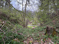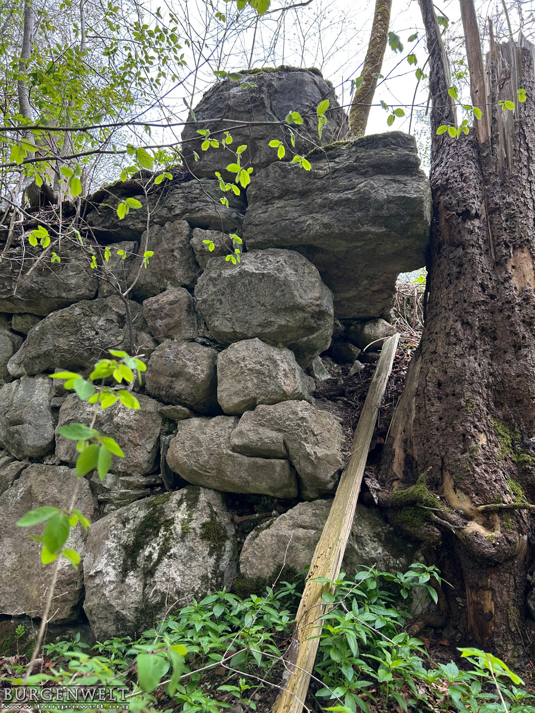 Vom Dorf her sehr gut erkennbar, ist die längliche Anhöhe zwischen der Bahnlinie und dem Abhang zur Simme durch drei Abschnittsgräben unterteilt. So wurden zwei Plateaus geschaffen und vermutlich nordseitig noch künstlich abgeböscht. Die westliche Fläche ist geräumiger und trug möglicherweise eine Vorburg mit Ökonomiegebäuden. Mauerreste sind hier keine mehr zu erkennen.