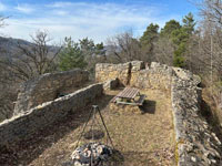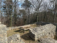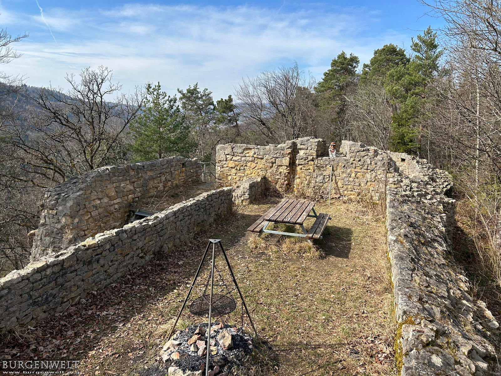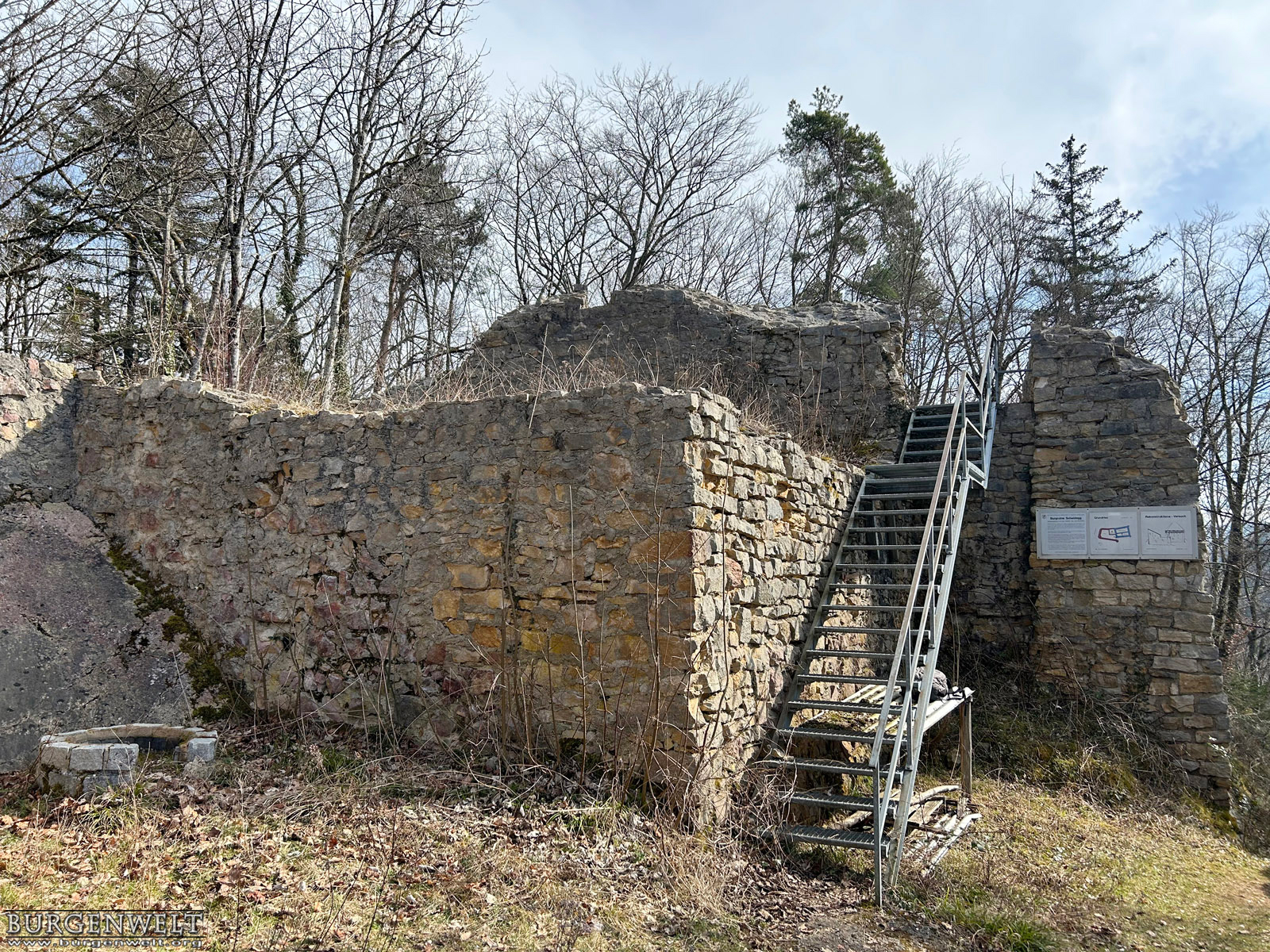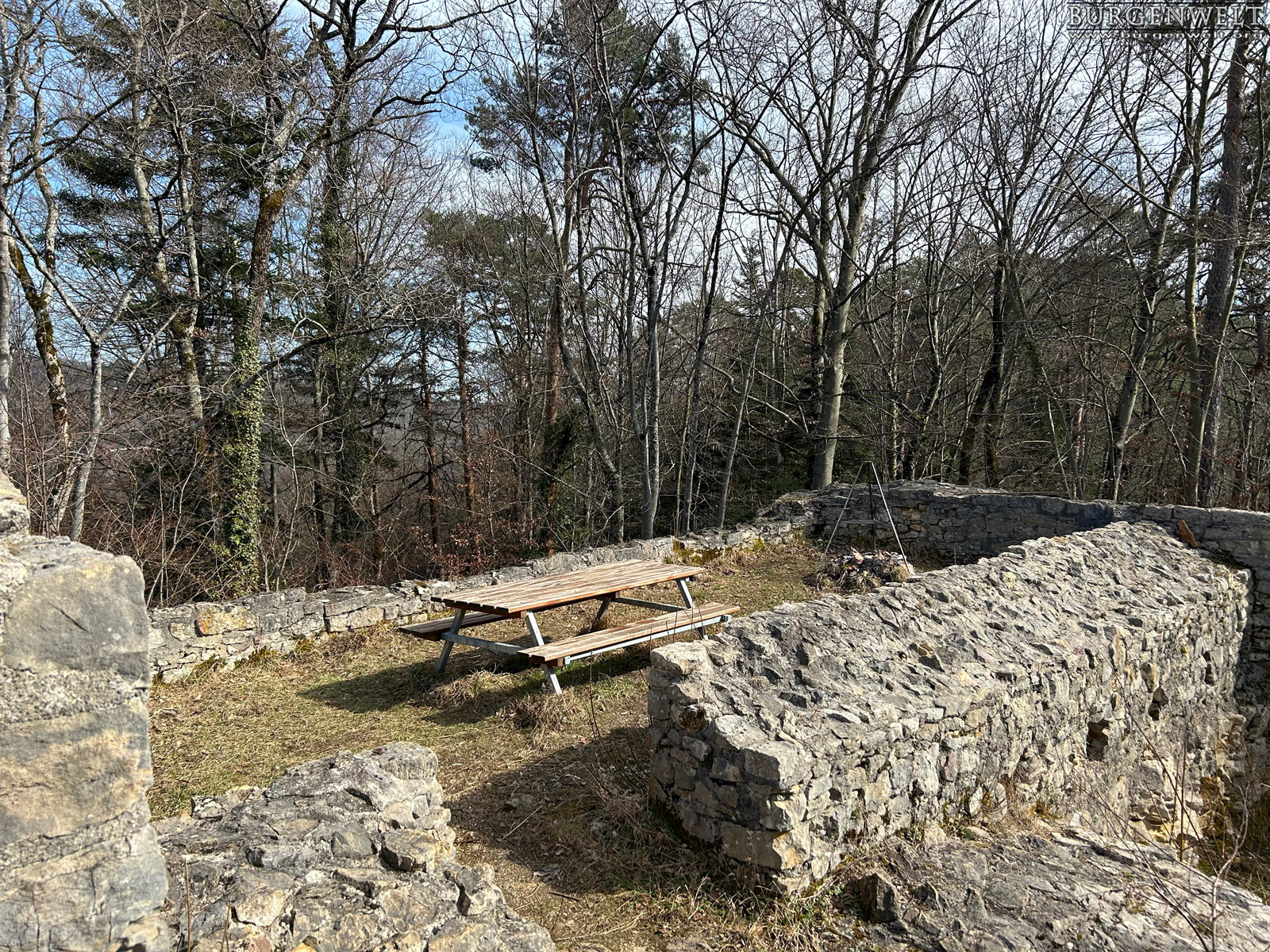| Ruine einer kompakten Rodungsburg auf dem Höhenrücken über dem Eital. Die Anlage aus dem frühen 13. Jhdt. gehörte wahrscheinlich den Herren von Gelterkinden und ist um 1320 einem Brand zum Opfer gefallen. Sichtbar sind die konservierten Mauerreste des Wohnturms, der Zisterne, der Ställe und des Burgtors. | |||||||||||||||||||||||||||||||