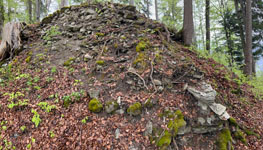 | Auf einem langgezogenen Geländesporn verteilte Überreste einer Burganlage nordöstlich über dem Dorf Diemtigen. Die heute als «Hasenburg» bezeichnete Ruine wurde im 13. Jhdt. als Herrschaftszentrum des Diemtigtals gegründet, gehörte zunächst den Freiherren von Strättlingen, später den Kyburgern, den Weissenburgern und im Spätmittelalter den Brandis. Nach dem Übergang an Bern 1439 wurde sie aufgegeben. | |||||||||||||||||||||||||||||||