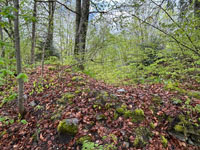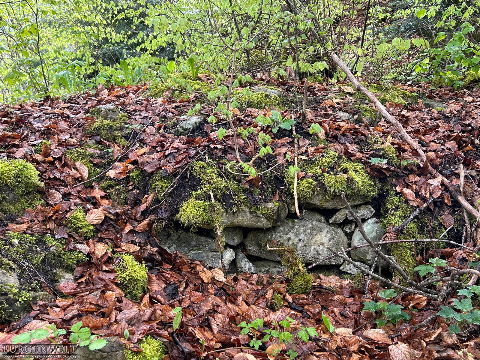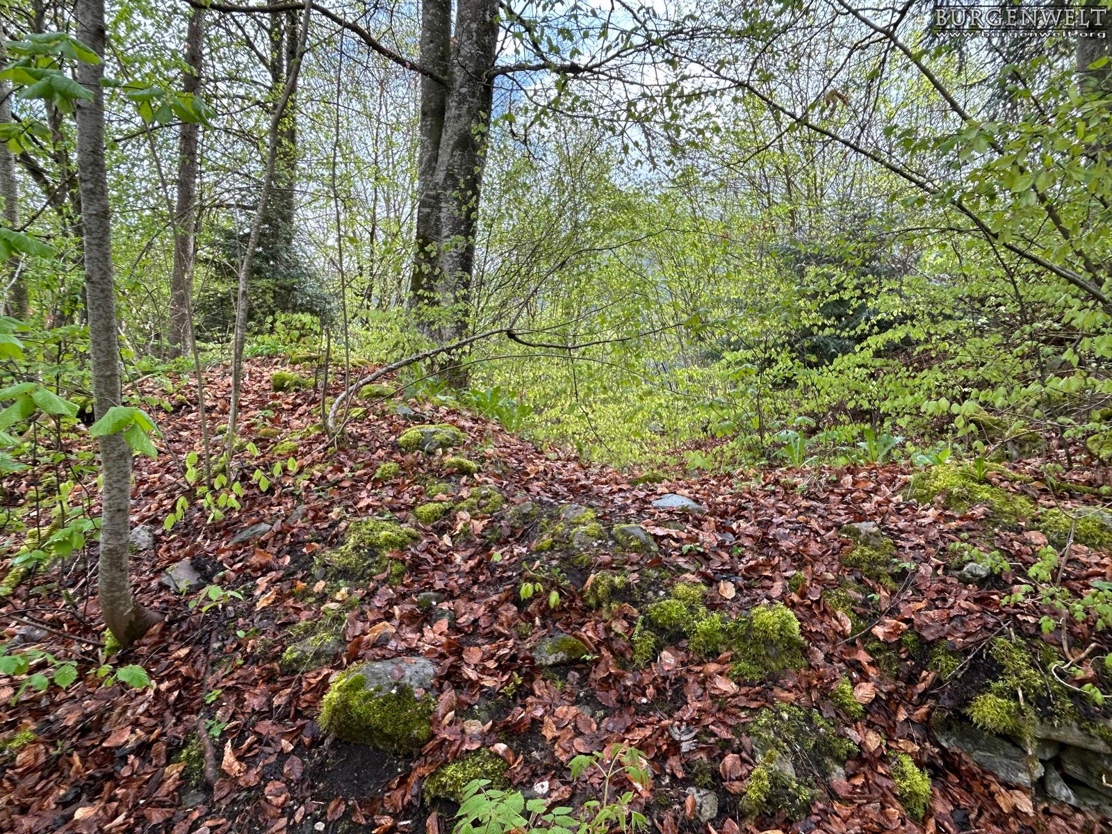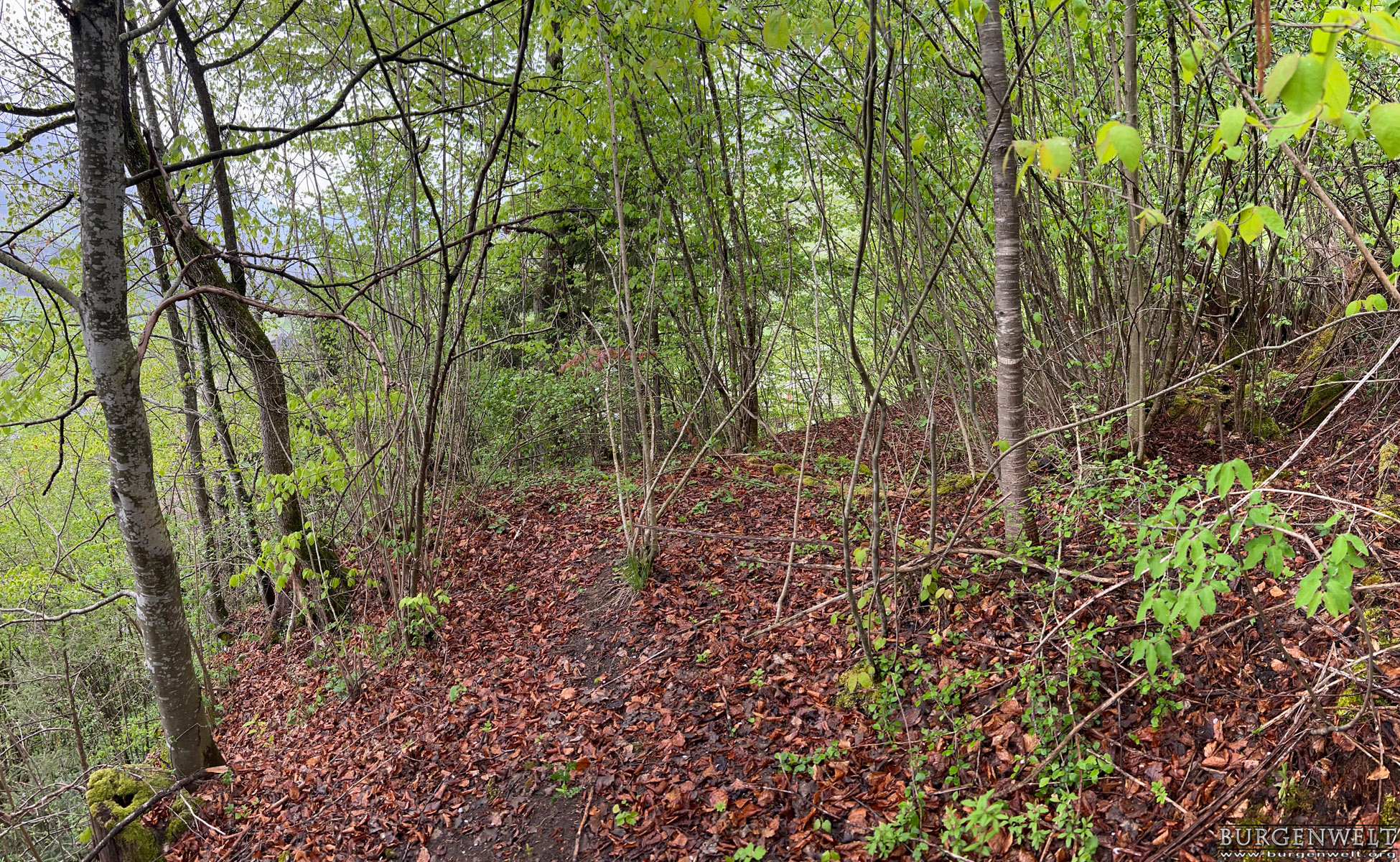 Der Pfrundhubel ist ein langgezogener Geländerücken, der sich über dem Dorfkern von Erlenbach im Simmental erhebt. Auf seinem östlichen Teil steht ein Schulhaus, bei dessen Errichtung man 1929 auf ein Turmfundament und diverse Kleinfunde stiess. Der Bau hatte einen quadratischen Grundriss mit 8,7 Metern Seitenlänge und 1,5 Meter starke Mauern aus sorgfältig gefügten Bruchsteinen. Man vermutete damals einen römischen Wachturm – eine These, die sich heute leider nicht mehr überprüfen lässt. Da die dokumentierten Funde jedoch teilweise aus dem Mittelalter stammen, stand der Turm vielleicht auch im Zusammenhang mit der Burganlage, deren Reste heute noch am anderen Ende des Hügels zu erkennen sind. Die erhaltenen Mauerspuren Der westliche Teil des Pfrundhubels ist heute von dichtem Wald bestanden und durch einen Wall vom Schulareal abgetrennt. Dieser zieht sich zusammen mit einem noch gut erkennbaren Graben dreiseitig um den zentralen Burghügel. Auf der Nordostseite ist auf dem Wall noch mittelalterliches Mauerwerk zu erkennen, offenbar der Rest einer Ringmauer. Auf dem Hügel selbst befinden sich die letzten Steinlagen einer Turmruine. Der stattliche Bau mass im Grundriss etwa 10 x 10 Meter. Südlich davon ist am Wall noch der Rest einer Sperrmauer erkennbar. Zusammen mit dem Turm scheint sie den Zugang zu einem Plateau auf der westlichen Seite des Burgareals geschützt zu haben, auf dem aber keine Mauerspuren mehr erhalten sind. Die Freiherren «de Arlundbach»im 12. Jhdt. Die Burg auf dem Pfrundhubel wird von der Forschung als Wohnsitz der 1133 erstmals erwähnten Freiherren Ulrich und Constantin «de Arlundbach» gedeutet. Sie zählten zu jenen frühen Adelsfamilien, die im Simmental durch Rodungen neue Siedlungsflächen erschlossen. Vermutet wird eine enge Verwandschaft mit den benachbarten Freiherren von Weissenburg. Auch der 1180 erwähnte Cuno de Arlundbach dürfte zu dieser Sippe gezählt haben. Die Ritter von Erlenbach im 13. und 14. Jhdt. Die neuere Forschung nimmt hingegen an, dass die ab dem 13. Jhdt. auftretenden Ritter von Arlundbach/Erlenbach einer anderen Familie entstammten. Ein Peter von Arlundbach wird 1223 und 1226, ein Ritter Rudolf von Arlundbach 1252 in den Schriftquellen erwähnt. 1360 werden noch zwei Söhne eines Junkers von Erlenbach genannt, danach verliert sich die Spur dieser Adelsfamilie. Über das Schicksal der Burg ist nichts weiter bekannt. |