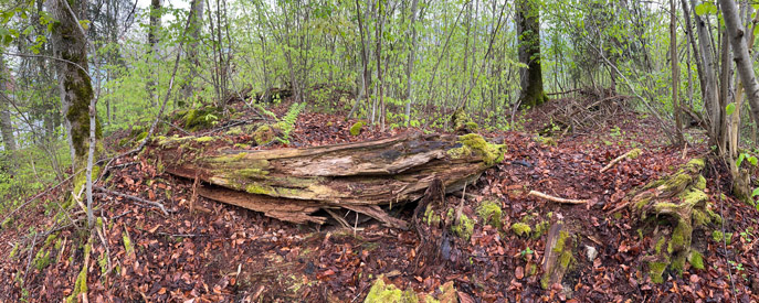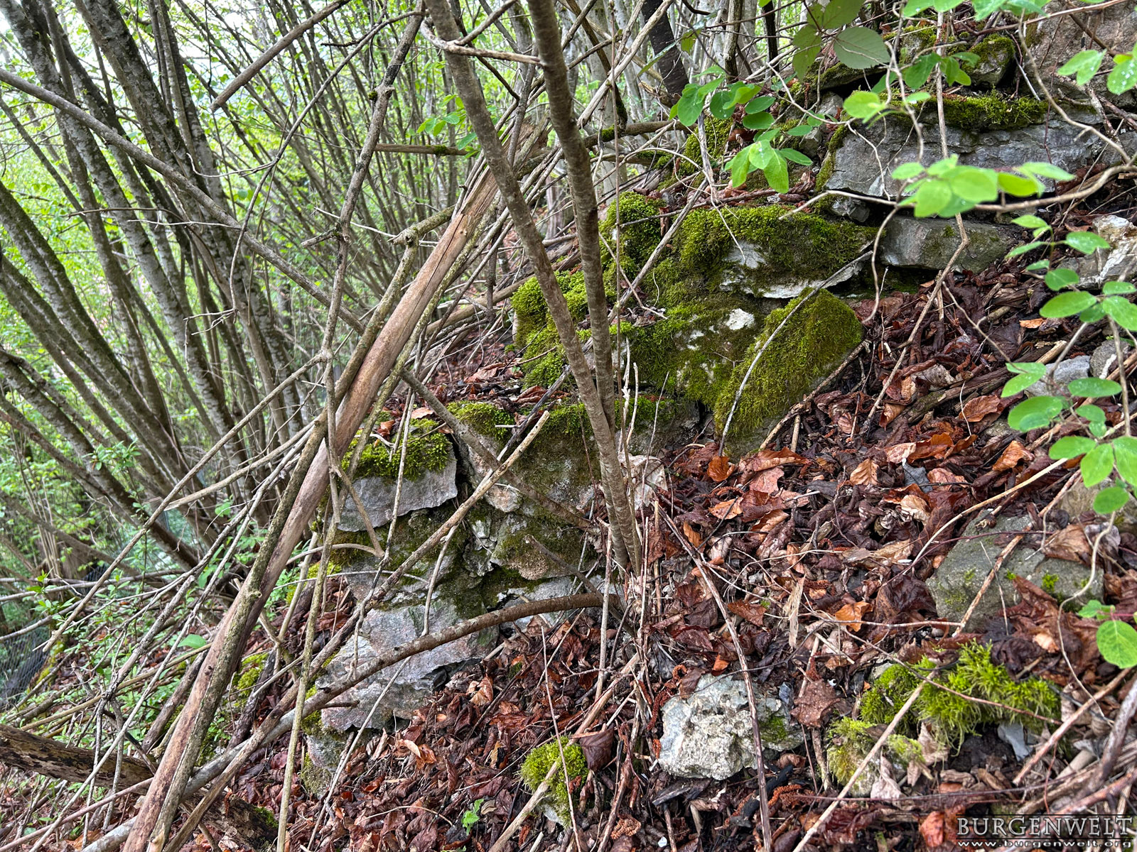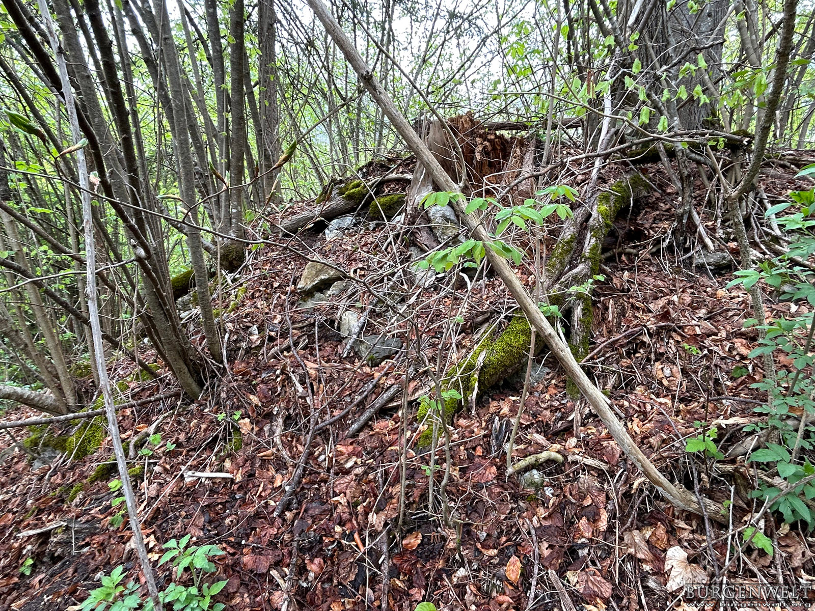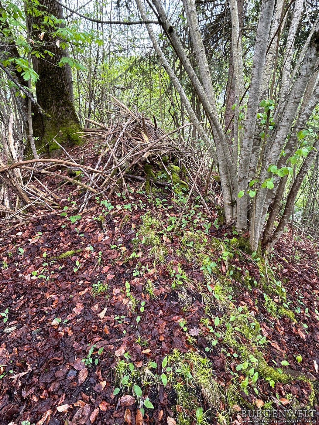 Der Pfrundhubel ist ein langgezogener Geländerücken, der sich über dem Dorfkern von Erlenbach im Simmental erhebt. Auf seinem östlichen Teil steht ein Schulhaus, bei dessen Errichtung man 1929 auf ein Turmfundament und diverse Kleinfunde stiess. Der Bau hatte einen quadratischen Grundriss mit 8,7 Metern Seitenlänge und 1,5 Meter starke Mauern aus sorgfältig gefügten Bruchsteinen. Man vermutete damals einen römischen Wachturm – eine These, die sich heute leider nicht mehr überprüfen lässt. Da die dokumentierten Funde jedoch teilweise aus dem Mittelalter stammen, stand der Turm vielleicht auch im Zusammenhang mit der Burganlage, deren Reste heute noch am anderen Ende des Hügels zu erkennen sind. Die erhaltenen Mauerspuren Der westliche Teil des Pfrundhubels ist heute von dichtem Wald bestanden und durch einen Wall vom Schulareal abgetrennt. Dieser zieht sich zusammen mit einem noch gut erkennbaren Graben dreiseitig um den zentralen Burghügel. Auf der Nordostseite ist auf dem Wall noch mittelalterliches Mauerwerk zu erkennen, offenbar der Rest einer Ringmauer. Auf dem Hügel selbst befinden sich die letzten Steinlagen einer Turmruine. Der stattliche Bau mass im Grundriss etwa 10 x 10 Meter. Südlich davon ist am Wall noch der Rest einer Sperrmauer erkennbar. Zusammen mit dem Turm scheint sie den Zugang zu einem Plateau auf der westlichen Seite des Burgareals geschützt zu haben, auf dem aber keine Mauerspuren mehr erhalten sind. Die Freiherren «de Arlundbach»im 12. Jhdt. Die Burg auf dem Pfrundhubel wird von der Forschung als Wohnsitz der 1133 erstmals erwähnten Freiherren Ulrich und Constantin «de Arlundbach» gedeutet. Sie zählten zu jenen frühen Adelsfamilien, die im Simmental durch Rodungen neue Siedlungsflächen erschlossen. Vermutet wird eine enge Verwandschaft mit den benachbarten Freiherren von Weissenburg. Auch der 1180 erwähnte Cuno de Arlundbach dürfte zu dieser Sippe gezählt haben. Die Ritter von Erlenbach im 13. und 14. Jhdt. Die neuere Forschung nimmt hingegen an, dass die ab dem 13. Jhdt. auftretenden Ritter von Arlundbach/Erlenbach einer anderen Familie entstammten. Ein Peter von Arlundbach wird 1223 und 1226, ein Ritter Rudolf von Arlundbach 1252 in den Schriftquellen erwähnt. 1360 werden noch zwei Söhne eines Junkers von Erlenbach genannt, danach verliert sich die Spur dieser Adelsfamilie. Über das Schicksal der Burg ist nichts weiter bekannt. |