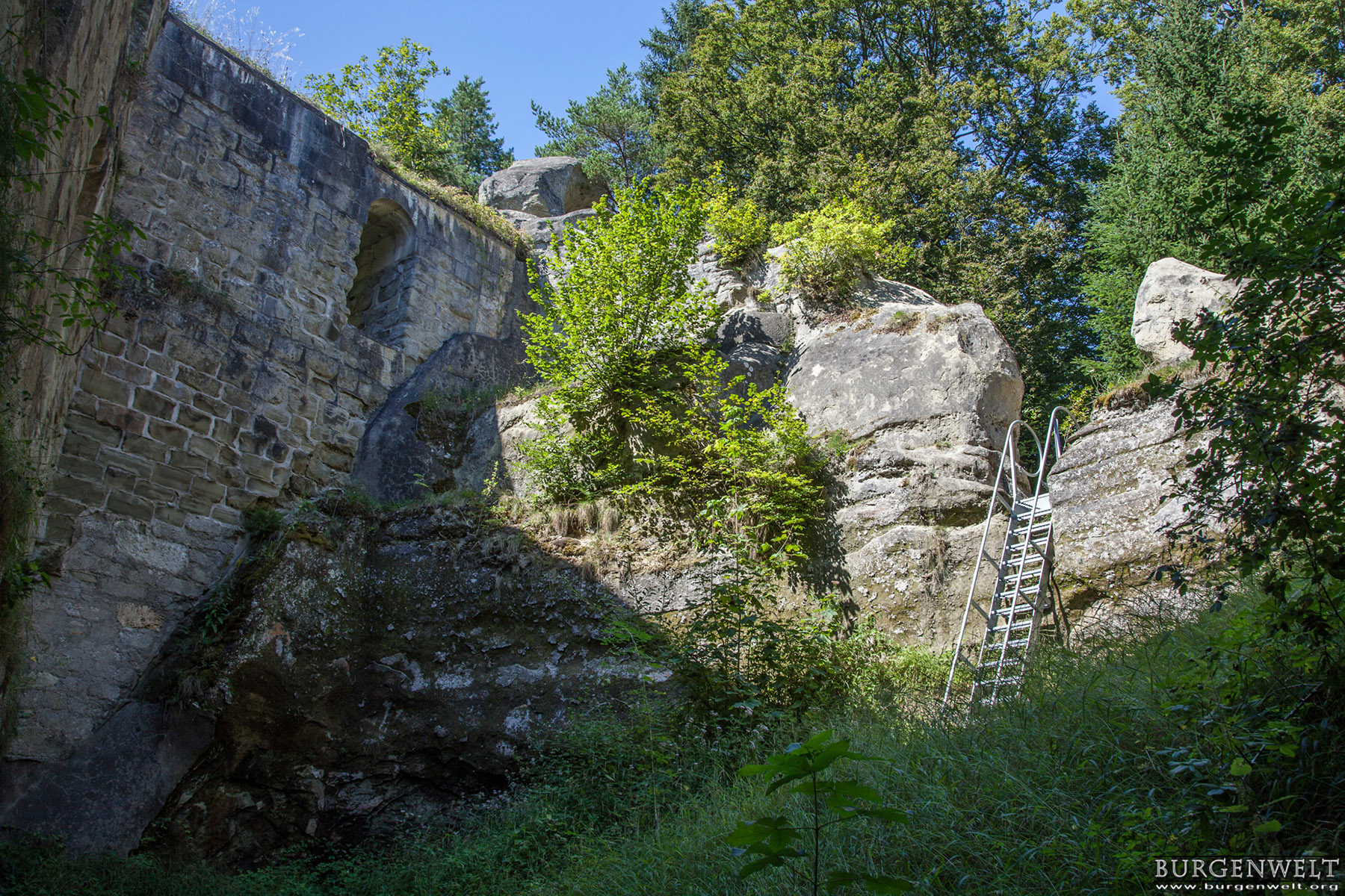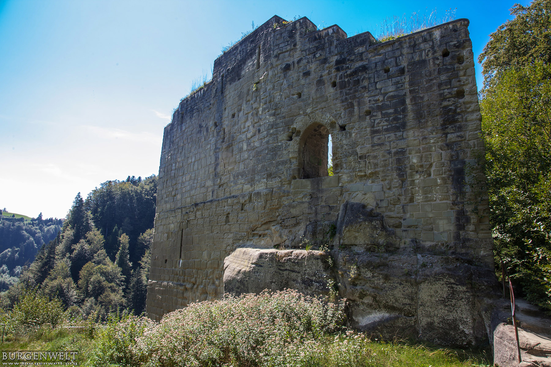 | Die grösste Burg des Kantons Bern steht auf einem imposanten Sandsteinfelsen in einer Flussschlaufe der Sense. Erhalten sind die Mauern der westlichen Kernburg und die Ruinen des Bergfrieds, eines Wohntrakts und Teile der Toranlagen am östlichen Ende des Areals. Eine erste, deutlich kleinere Burg wurde vielleicht schon unter den Herzögen von Zähringen gegründet. Die heute sichtbaren Ruinen stammen jedoch mit grösster Wahrscheinlichkeit von einer staufischen Reichsburg, in den 1230er-Jahren zur Sicherung der Kronrechte in Burgund errichtet. Die im Interregnum umkämpfte Anlage befand sich später in kyburgischem, habsburgischem und savoyischem Besitz, kam 1423 an Bern und Freiburg und wurde im 16. Jhdt. aufgelassen. | |||||||||||||||||||||||||||||||