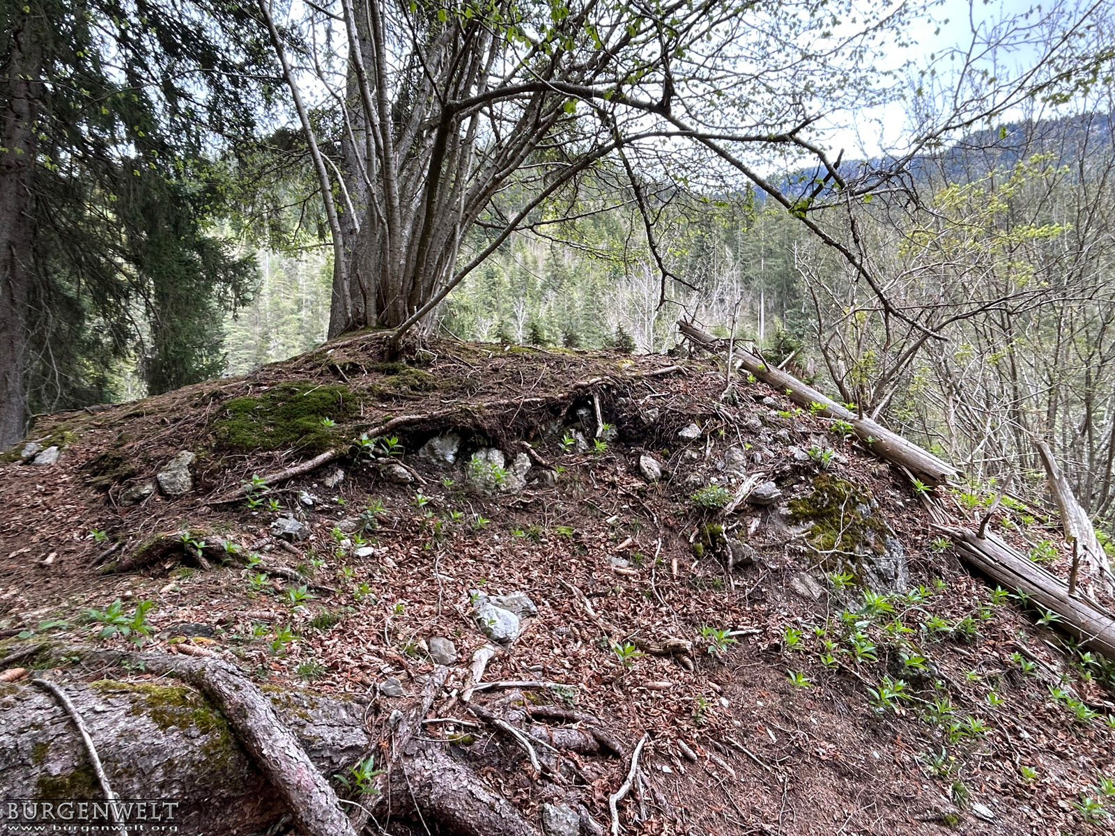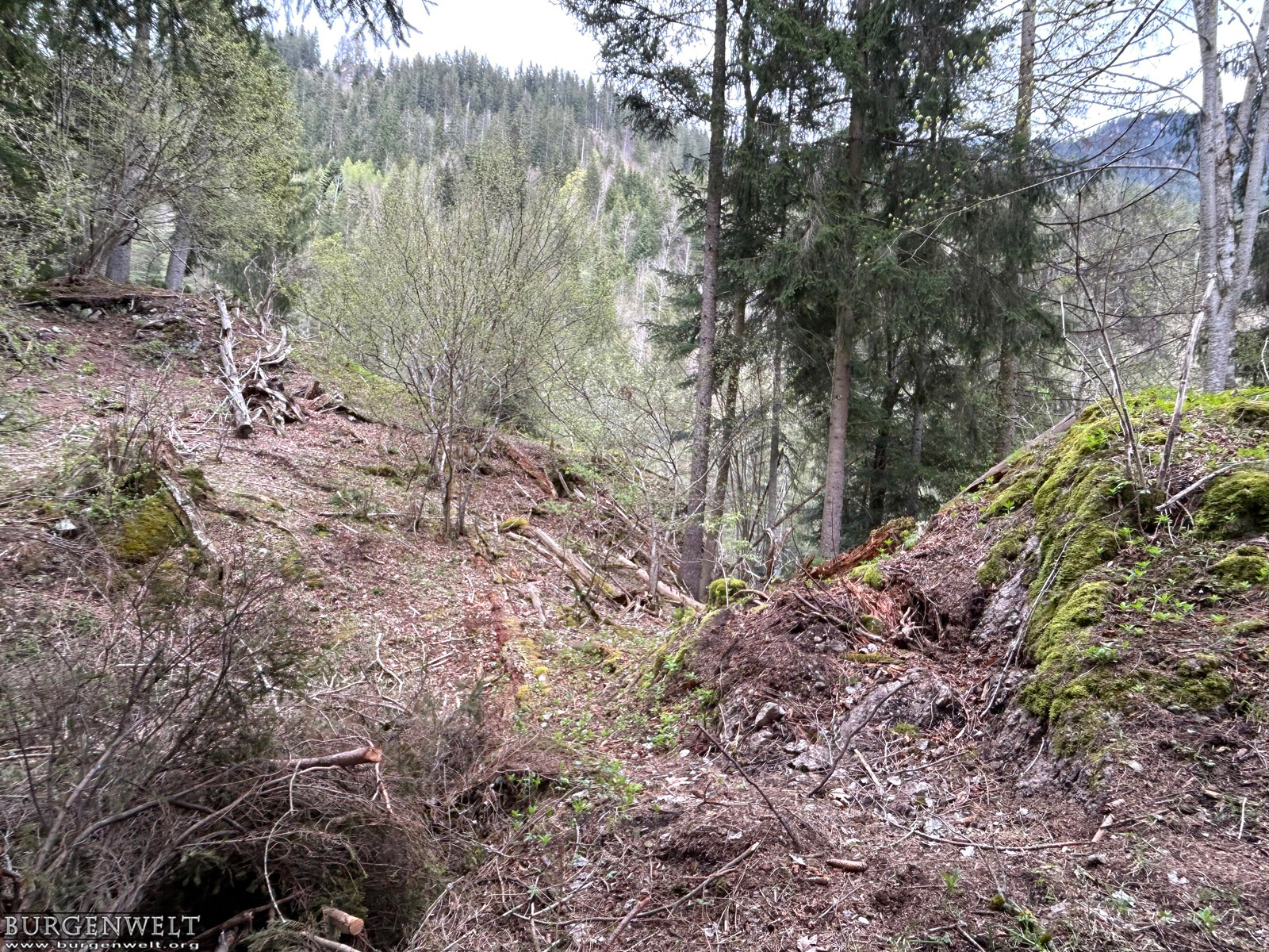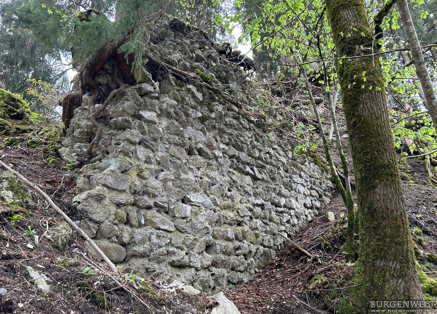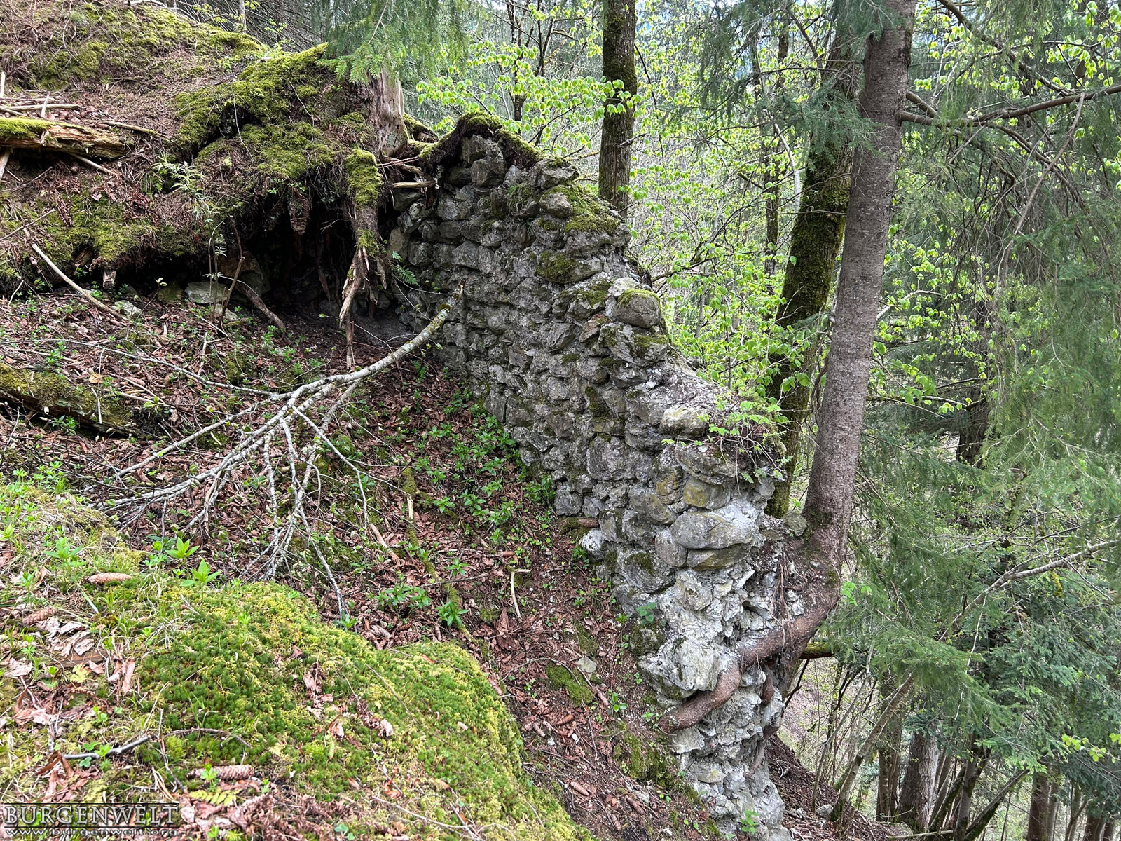 Die Burg Laubegg dürfte spätestens im 13. Jhdt. entstanden sein, taucht aber erst 1326 in den Schriftquellen auf. Damals befand sie sich im Besitz der Freiherren von Strättligen, die zu jener Zeit auch die benachbarten Burgen auf dem Mannenberg als Reichslehen innehatten. Laubegg scheint jedoch der bevorzugte Wohnsitz von Heinrich IV. von Strättligen gewesen zu sein, denn er nannte sich nahezu ausschliesslich nach dieser Burg. Wirtschaftliche Schwierigkeiten zwangen ihn allerdings in den 1330er-Jahren, seine Güter und Rechte im Simmental nach und nach zu veräussern. So gelangte Laubegg zusammen mit den Mannenberg-Burgen 1336 an Graf Peter von Greyerz. Zerstörung der Burg im zweiten Versuch Nachdem die Stadt Bern bis 1337 das Simmental bis hinauf zur Burg Simmenegg weitgehend unter ihre Kontrolle gebracht hatte, wurde Laubegg zum Vorposten gegen den aufstrebenden Stadtstaat. Da die Grafen von Greyerz im Laupenkrieg von 1339 zu den wichtigsten Gegnern Berns zählten, liessen die Auseinandersetzungen nicht lange auf sich warten. 1346 zog Bern erstmals aus, um Laubegg zu erobern, doch gerieten die Truppen bereits im Anstieg zur Burg in einen Hinterhalt und mussten ungeordnet fliehen. Gegen Ende des Jahres 1349 wagte Bern einen zweiten Versuch, und diesmal war es erfolgreich. Nun wurde nicht nur die Burg Laubegg zerstört, auch die beiden Burgen auf dem Mannenberg wurden geplündert und in Brand gesteckt. Übergang an die Herren von Düdingen und Zerfall Ob Laubegg nach 1349 nochmals hergerichtet wurde, ist nicht unklar. 1356 verkaufte Graf Peter von Greyerz seine Herrschaftgebiete im Obersimmental an Jakob von Düdingen, dem bereits die Blankenburg gehörte. 1377 räumten die Düdinger der Stadt Freiburg ein Öffnungsrecht für ihre Burgen im Obersimmental ein, darunter auch für Laubegg. Das muss aber nicht zwingend heissen, dass die Burg damals noch bewohnt war. Wahrscheinlicher ist, dass sie im Zerfall begriffen war, denn ihre Bedeutung als Herrschaftsmittelpunkt hatte sie längst verloren. Als Bern 1386 das Obersimmental endgültig eroberte, spielte die Wehranlage keine Rolle mehr. Heutiger Zustand der Burgruine Die ausgedehte Ruine ist bis heute nie systematisch untersucht oder gesichert worden. Sie stand auf dem exponierten Felssporn am äussersten Ende eines Geländerückens, der zwei Kilometer nördlich des Mannenbergs von Südwesten her ins Simmental vorragt und den Fluss in eine enge Schlucht zwingt. Bis zum Bau der heutigen Hauptstrasse um 1820 führte der Talweg bergseits der Burg über den sogenannten Laubeggstalden. Zwei tiefe Einschnitte durchtrennen den Geländerücken. Ob die dazwischenliegende Anhöhe einst besidelt war, ist ungeklärt – möglicherweise wurde hier auch nur beim Bau der Burg Steinmateraial abgetragen oder 1349 von den Belagerern ein Plateau angelegt. Der innere Graben diente als Halsgraben. Das eigentliche Burgareal wurde bergseits durch eine Schildmauer abgeschirmt, von der heute noch letzte Steinlagen erkennbar sind. Dahinter folgte das etwas erhöhte Plateau der Kernburg, deren räumliche Gliederung ohne Grabungen nicht mehr nachvollziehbar ist. Zusammen mit dem nordöstlich anschliessenden Burghof war dieser Teil umgeben von einer Ringmauer. Auf der West- und Nordwetsseite war diese in den steilen Hang hineingebaut und ist an einer Stelle noch mehrere Meter hoch erhalten. Auf der Ostseite folgte der Bering hingegen der senkrecht abfallenden Felskante. Auch hier sind noch einige Mauerreste erkennbar. Auf dem äussersten Felskopf, der auf drei Seiten direkt gegen die Simme hin abfällt, lassen sich die Fundamente eines Turms ausmachen. Möglicherweise stand an dieser weithin sichtbaren Stelle einst der Bergfried von Laubegg.  |