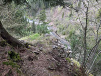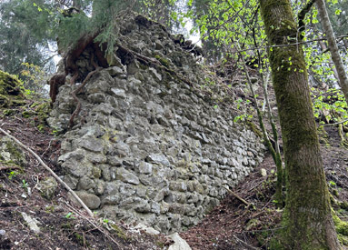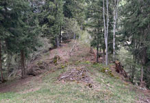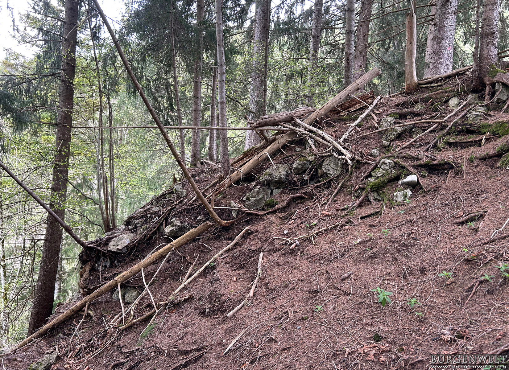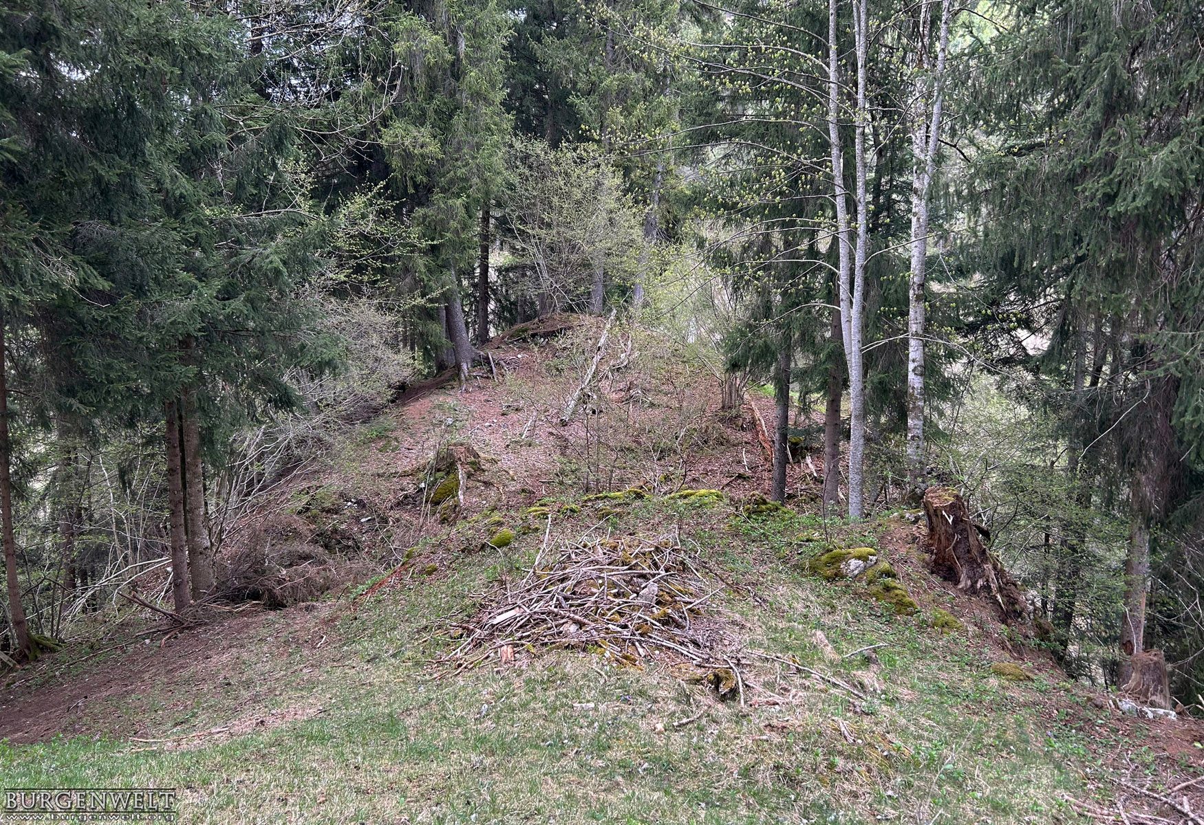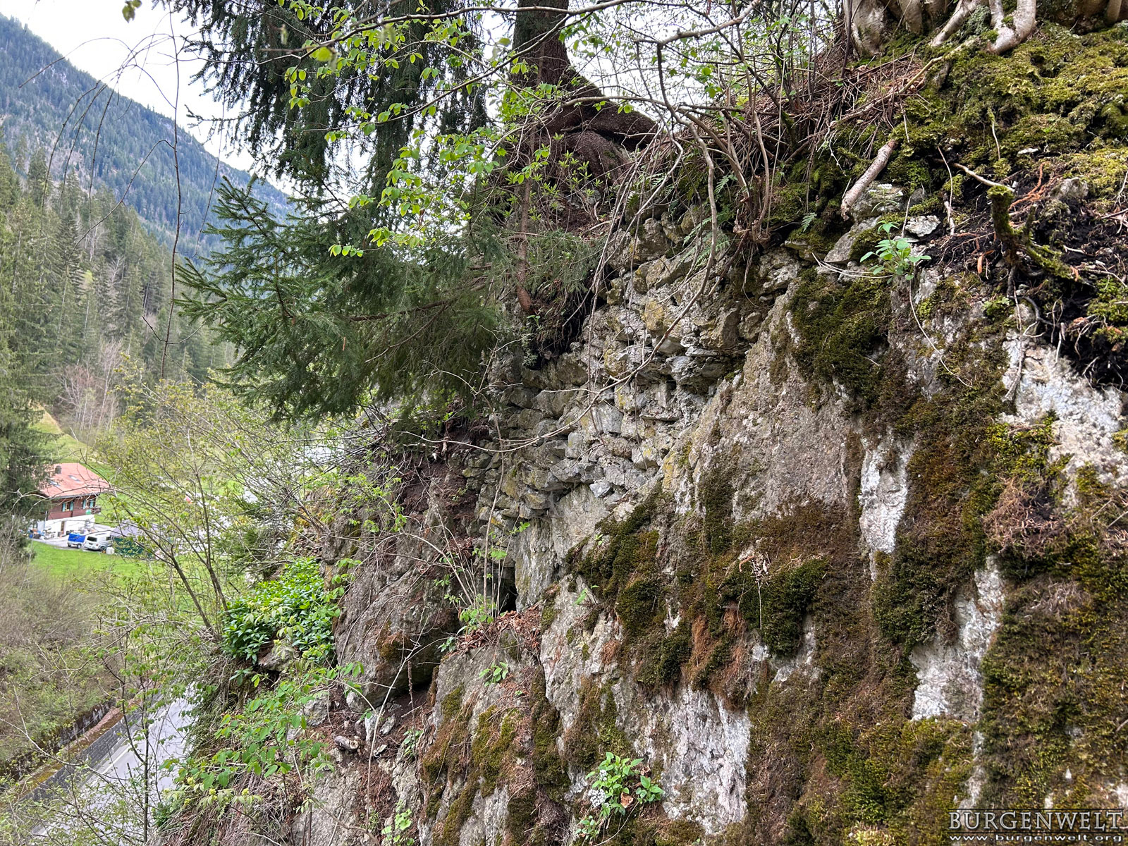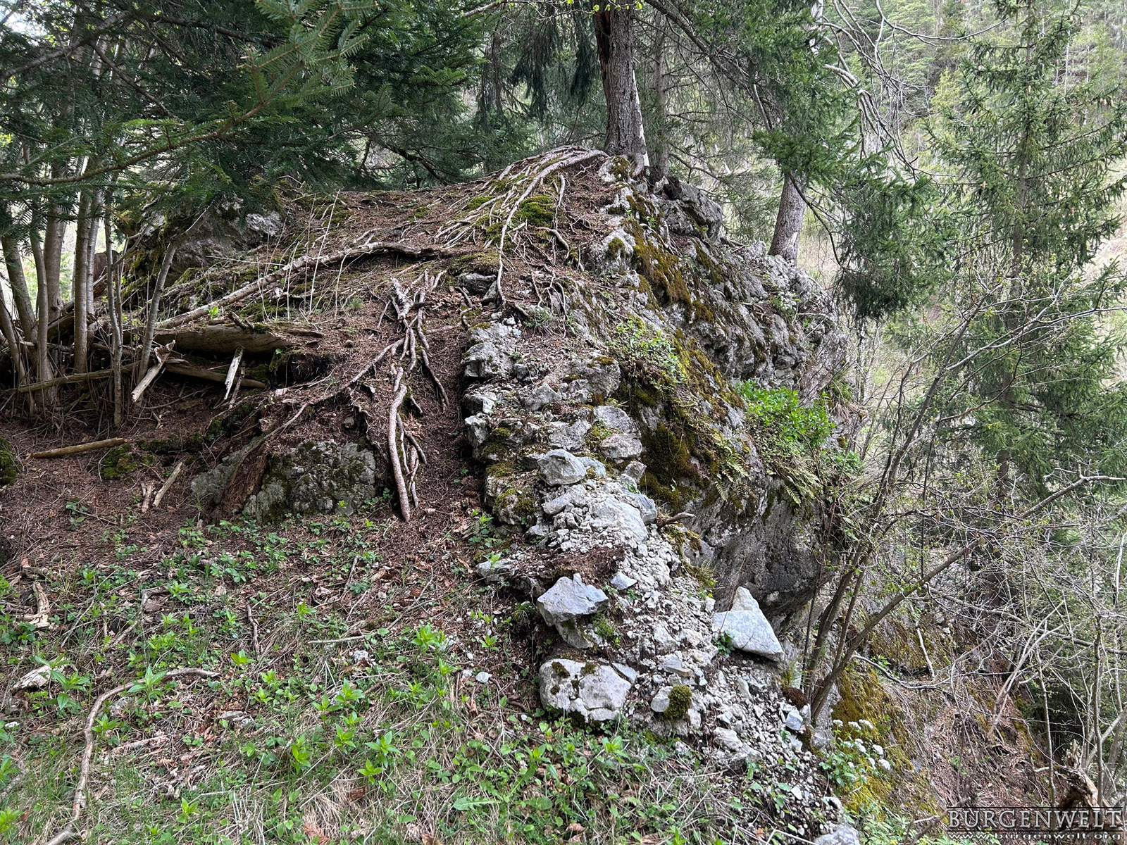 Die Burg Laubegg dürfte spätestens im 13. Jhdt. entstanden sein, taucht aber erst 1326 in den Schriftquellen auf. Damals befand sie sich im Besitz der Freiherren von Strättligen, die zu jener Zeit auch die benachbarten Burgen auf dem Mannenberg als Reichslehen innehatten. Laubegg scheint jedoch der bevorzugte Wohnsitz von Heinrich IV. von Strättligen gewesen zu sein, denn er nannte sich nahezu ausschliesslich nach dieser Burg. Wirtschaftliche Schwierigkeiten zwangen ihn allerdings in den 1330er-Jahren, seine Güter und Rechte im Simmental nach und nach zu veräussern. So gelangte Laubegg zusammen mit den Mannenberg-Burgen 1336 an Graf Peter von Greyerz. Zerstörung der Burg im zweiten Versuch Nachdem die Stadt Bern bis 1337 das Simmental bis hinauf zur Burg Simmenegg weitgehend unter ihre Kontrolle gebracht hatte, wurde Laubegg zum Vorposten gegen den aufstrebenden Stadtstaat. Da die Grafen von Greyerz im Laupenkrieg von 1339 zu den wichtigsten Gegnern Berns zählten, liessen die Auseinandersetzungen nicht lange auf sich warten. 1346 zog Bern erstmals aus, um Laubegg zu erobern, doch gerieten die Truppen bereits im Anstieg zur Burg in einen Hinterhalt und mussten ungeordnet fliehen. Gegen Ende des Jahres 1349 wagte Bern einen zweiten Versuch, und diesmal war es erfolgreich. Nun wurde nicht nur die Burg Laubegg zerstört, auch die beiden Burgen auf dem Mannenberg wurden geplündert und in Brand gesteckt. Übergang an die Herren von Düdingen und Zerfall Ob Laubegg nach 1349 nochmals hergerichtet wurde, ist nicht unklar. 1356 verkaufte Graf Peter von Greyerz seine Herrschaftgebiete im Obersimmental an Jakob von Düdingen, dem bereits die Blankenburg gehörte. 1377 räumten die Düdinger der Stadt Freiburg ein Öffnungsrecht für ihre Burgen im Obersimmental ein, darunter auch für Laubegg. Das muss aber nicht zwingend heissen, dass die Burg damals noch bewohnt war. Wahrscheinlicher ist, dass sie im Zerfall begriffen war, denn ihre Bedeutung als Herrschaftsmittelpunkt hatte sie längst verloren. Als Bern 1386 das Obersimmental endgültig eroberte, spielte die Wehranlage keine Rolle mehr. Heutiger Zustand der Burgruine Die ausgedehte Ruine ist bis heute nie systematisch untersucht oder gesichert worden. Sie stand auf dem exponierten Felssporn am äussersten Ende eines Geländerückens, der zwei Kilometer nördlich des Mannenbergs von Südwesten her ins Simmental vorragt und den Fluss in eine enge Schlucht zwingt. Bis zum Bau der heutigen Hauptstrasse um 1820 führte der Talweg bergseits der Burg über den sogenannten Laubeggstalden. Zwei tiefe Einschnitte durchtrennen den Geländerücken. Ob die dazwischenliegende Anhöhe einst besidelt war, ist ungeklärt – möglicherweise wurde hier auch nur beim Bau der Burg Steinmateraial abgetragen oder 1349 von den Belagerern ein Plateau angelegt. Der innere Graben diente als Halsgraben. Das eigentliche Burgareal wurde bergseits durch eine Schildmauer abgeschirmt, von der heute noch letzte Steinlagen erkennbar sind. Dahinter folgte das etwas erhöhte Plateau der Kernburg, deren räumliche Gliederung ohne Grabungen nicht mehr nachvollziehbar ist. Zusammen mit dem nordöstlich anschliessenden Burghof war dieser Teil umgeben von einer Ringmauer. Auf der West- und Nordwetsseite war diese in den steilen Hang hineingebaut und ist an einer Stelle noch mehrere Meter hoch erhalten. Auf der Ostseite folgte der Bering hingegen der senkrecht abfallenden Felskante. Auch hier sind noch einige Mauerreste erkennbar. Auf dem äussersten Felskopf, der auf drei Seiten direkt gegen die Simme hin abfällt, lassen sich die Fundamente eines Turms ausmachen. Möglicherweise stand an dieser weithin sichtbaren Stelle einst der Bergfried von Laubegg.  |