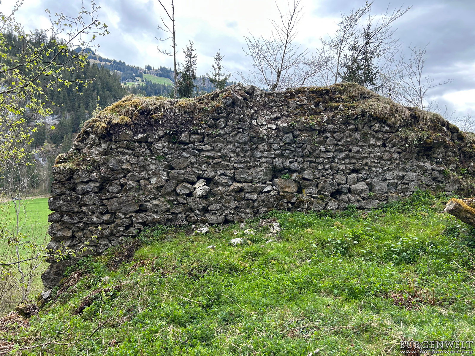| Spärliche, überwachsene Mauerreste auf dem höchsten Punkt des Mannenbergs. Die einst sehr weitläufige Anlage bildete zusammen mit der unteren Burg bis zu ihrer Zerstörung 1349 das Herrschaftszentrum des Obersimmentals. | |||||||||||||||||||||||||||||||
