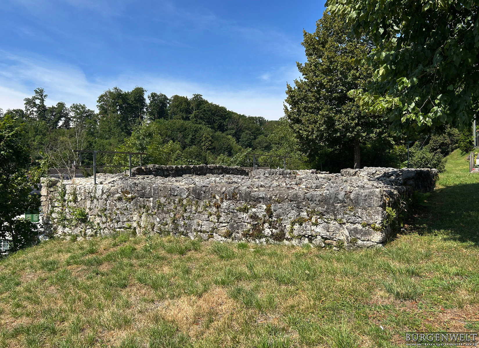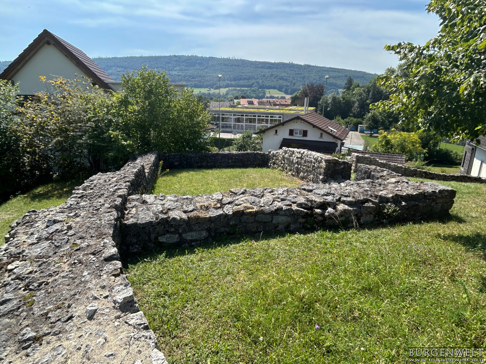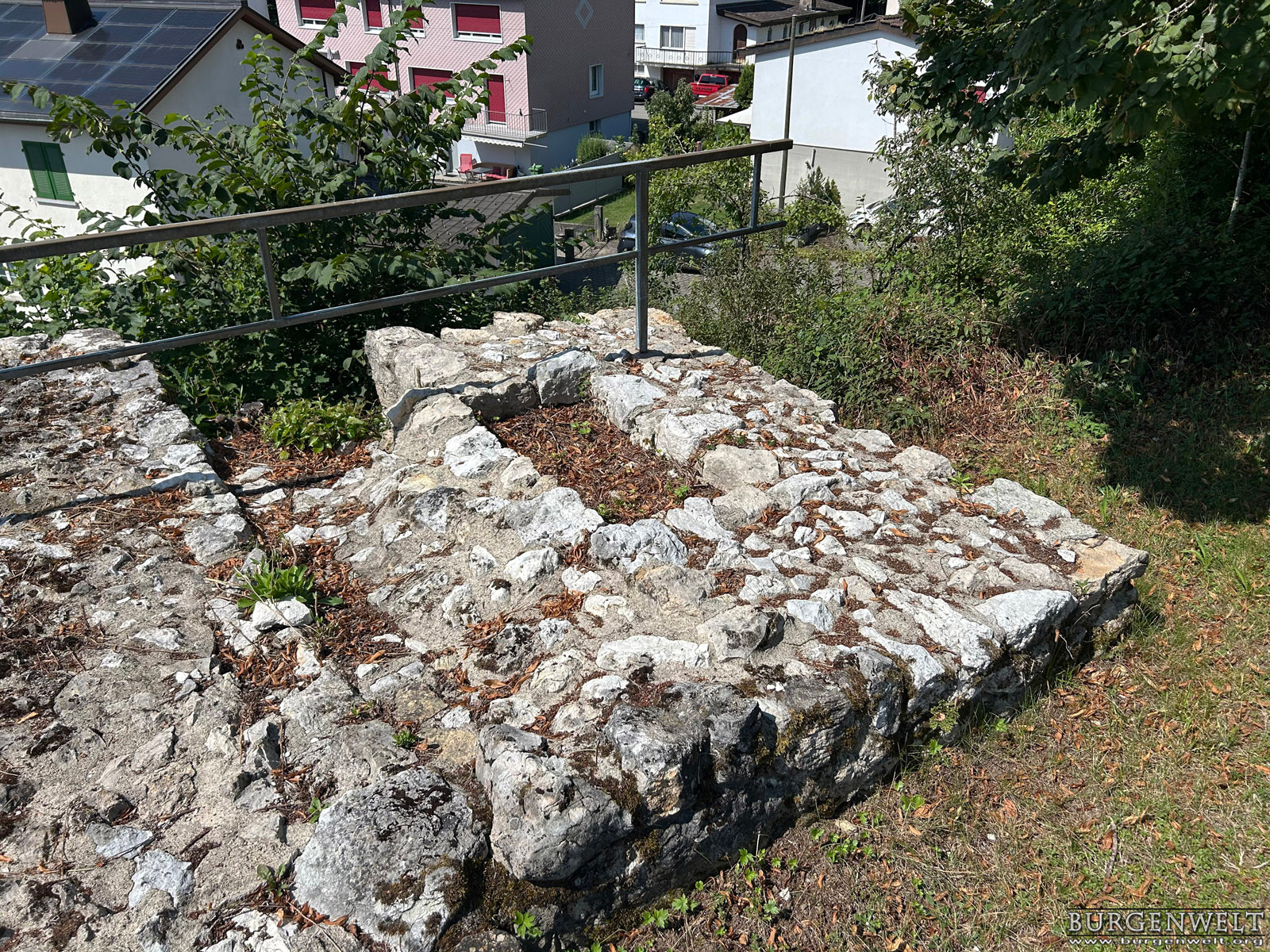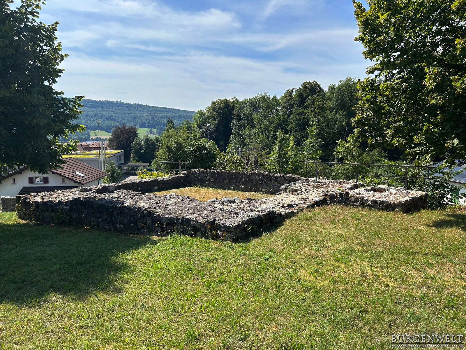 | Ruine einer sehr frühen Steinburg auf dem niedrigen Felsrücken «Büntenrain» über dem Dorf Rickenbach. Sichtbar sind die konservierten Grundmauern des Wohnturms, eines Pferdestalls und der Ringmauer. Die Anlage wurde sehr wahrscheilich im frühen 11. Jhdt durch die Grafen von Rheinfelden errichtet, nach 1080 unter der Herrschaft des Basler Bischofs umgebaut und bald nach 1100 aufgegeben. | |||||||||||||||||||||||||||||||