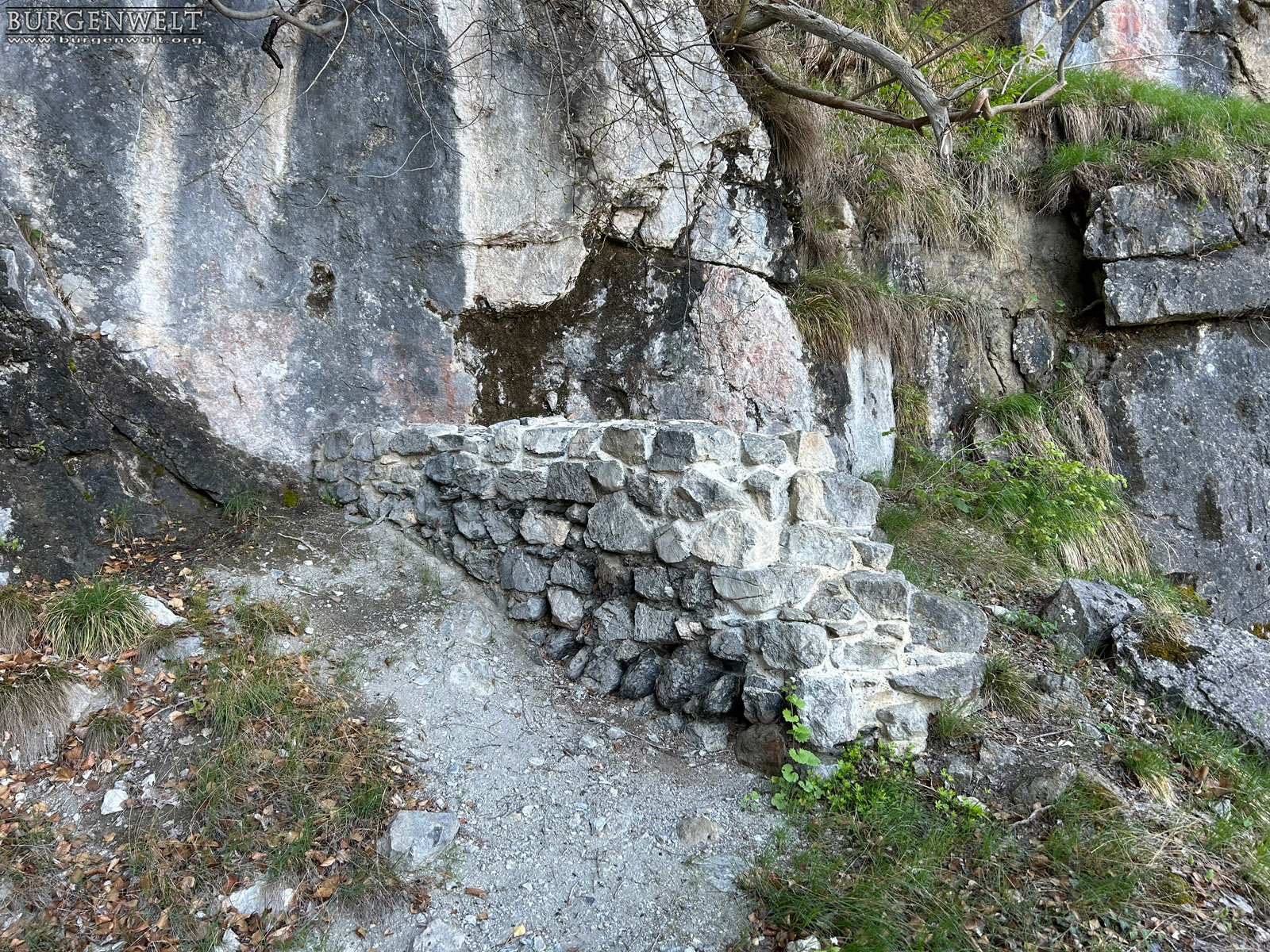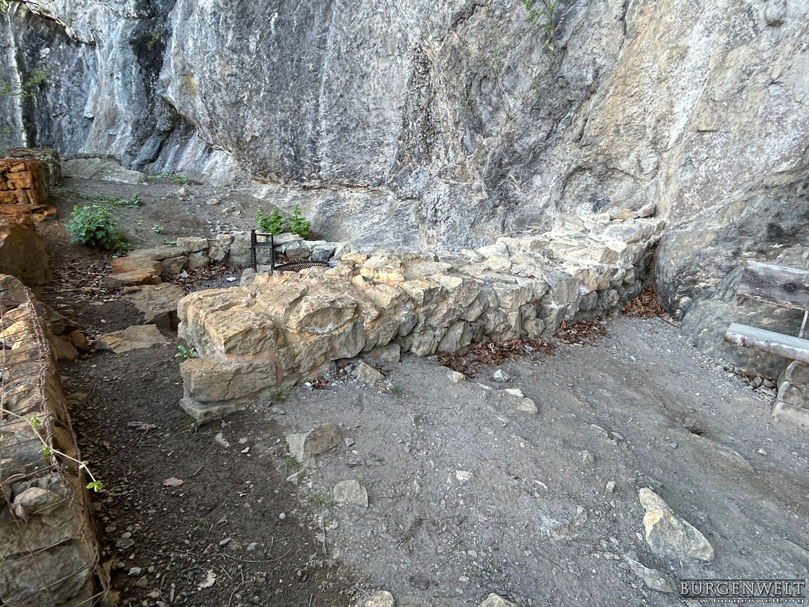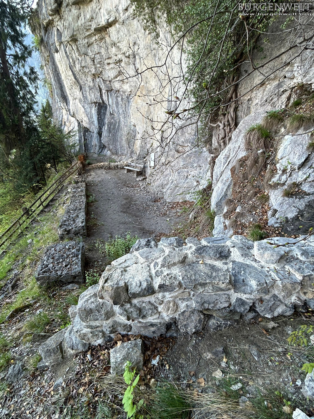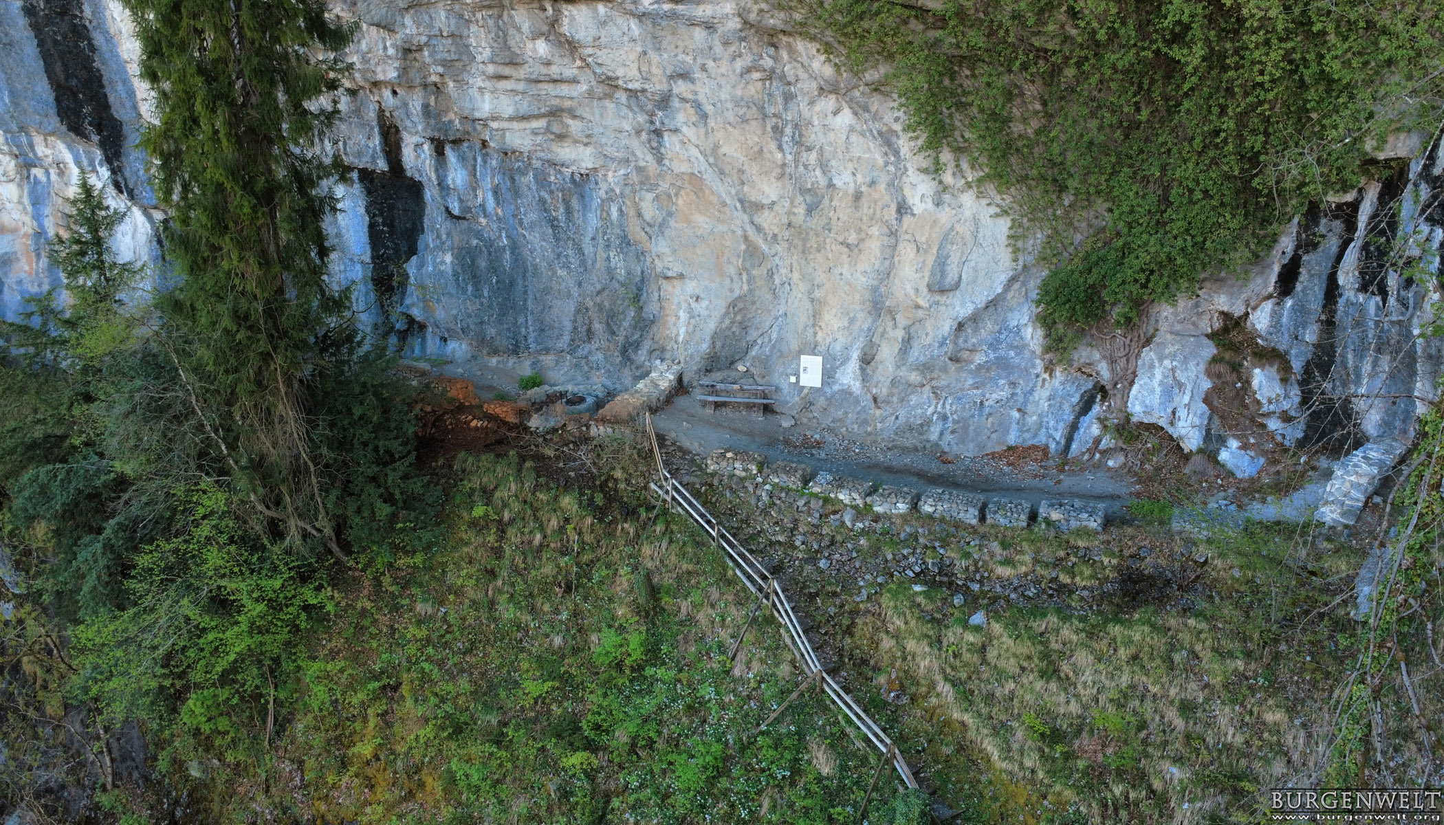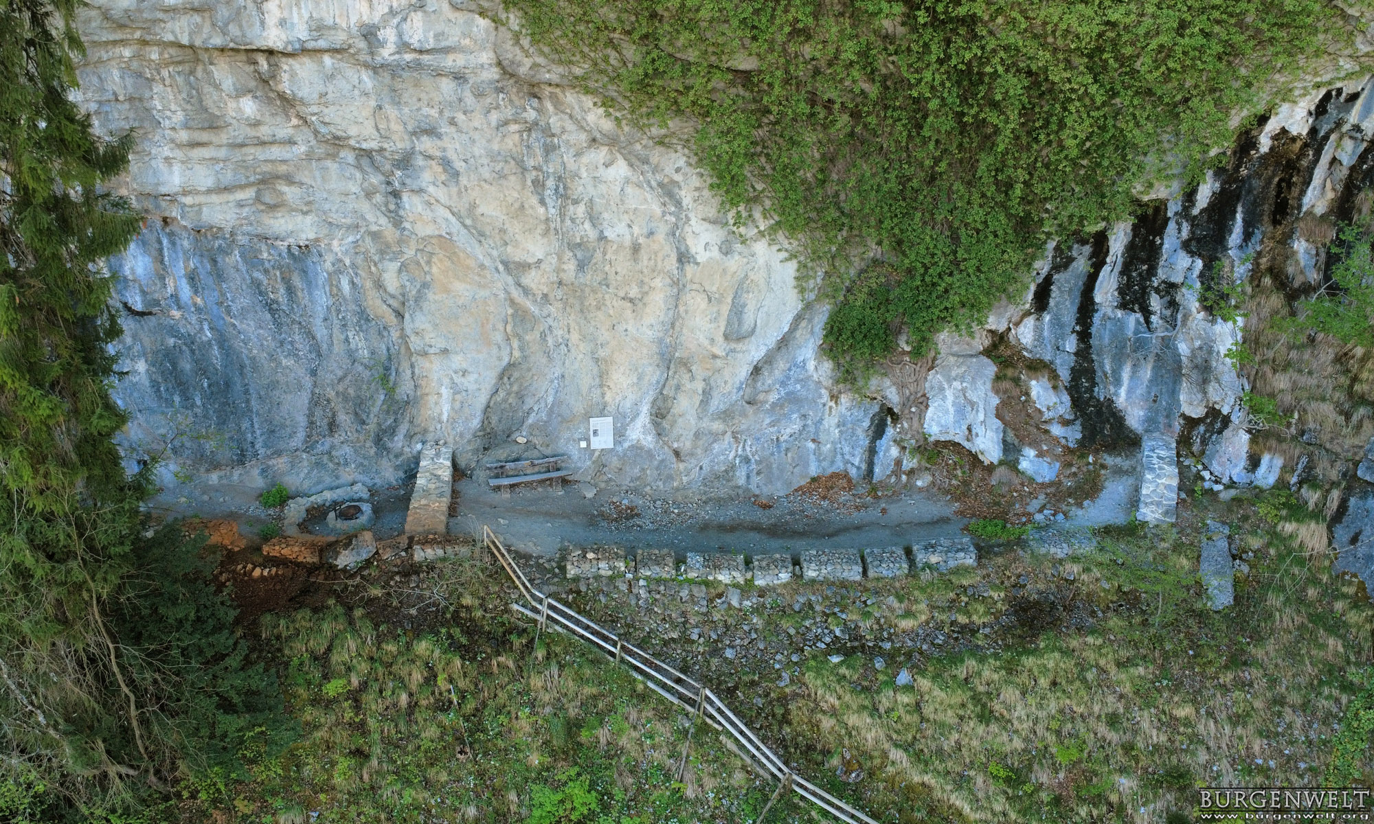 Rothenfluh ist die einzige Grotten- oder Balmburg im Kanton Bern, von der heute noch Mauerreste erhalten sind. Der in extremer Lage auf einem Felsabsatz in der Tschingelfluh errichtete Bau gilt als namensgebender Sitz der Freiherren von Rothenfluh-Wilderswil. Diese Familie taucht 1221 erstmals in den Quellen auf, als sie sich mit dem Augustinerkloster Interlaken um die Einsetzung eines Priesters für die Kirche Gsteig stritt, in dessen Verlauf auch Papst Honorius III. angerufen wurde. Gemäss einer Volkssage setzte der Niedergang der Familie nach einem Brudermord ein, der in den mittelalterlichen Quellen aber nicht belegt ist. Eine letzte, nur indirekte Erwähnung stammt aus dem Jahr 1252. Damals trat ein Burkard, Dienstmann der Herrin von Rothenfluh, als Zeuge für eine Güterübertragung auf. Burg und Bergwerk Rothenfluh dürfte im frühen 13. Jhdt. entstanden sein. Namensgebend für die Burg waren vermutlich die rostroten Verfärbungen an der über ihr aufragenden Felswand. Hier wurde im Mittelalter Eisenerz abgebaut. In der Wand sind an mehreren Stellen kleine Stollen vorhanden. Die Wehranlage selbst füllte die Grotte oder Höhle unter der weiten Balm nahezu vollständig aus. Sie bestand aus zwei Teilen, wovon der westliche als Wohntrakt gedeutet wird. Er mass rund 6 x 15 Meter und bestand aus einem zweistöckigen steinernen Sockel, der wahrscheinlich einen hölzernen Oberbau mit Pultdach trug. Der kleinere östliche Teil, von dem eine Tür in den Wohntrakt führte, wird als Burghof gedeutet. Besitzerwechsel im Spätmittelalter In einer Quelle von 1298 wird die «munitio sive balma dicta Rotenfluo» zum ersten Mal direkt erwähnt. Die Burg gehörte damals Rudolf III. von Weissenburg, der sie – wahrscheinlich zusammen mit Weissenau – einige Zeit zuvor durch Heirat von den Freiherren von Wädenswil geerbt hatte. In jenem Jahr musste er beide Burgen wegen Landfriedensbruch an die Grafen von Neu-Kyburg übergeben. 1316 konnte Johannes von Weissenburg die Herrschaften Rothenfluh, Weissnau und Unspunnen aber in einer Hand vereinen, weil er sie von den Habsburgern als Pfand erhielt. Die Grottenburg wird 1324 als «castrum» bezeichnet, sie galt also weiterhin als Wehranlage. Nachdem er 1334 von Bern zur Offenhaltung seiner Burgen gezwungen worden war, begann Johannes von Weissenburg damit, Teile der alten Herrschaft Rothenfluh zu verkaufen. So kam 1335 die Hälfte der Balm Rothenfluh ans Kloster Interlaken. Die zweite Hälfte gelangte auf ungeklärte Weise an die Freiherren von Turn, die diese 1346 zusammen mit weiteren Gütern ebenfalls ans Kloster Interlaken veräusserten. Doch diese Verkäufe scheinen nur den Fels der Balm mit den Erzadern betroffen zu haben, denn erst nach dem Volksaufstand im Wallis von 1375 verkaufte Anton I. von Turn dem Kloster Interlaken auch die Burg selbst, die «lange zyt unbesetzet» gewesen sei. Zerfall und Konservierung Dass die Grottenburg nach diesem letzten Verkauf noch genutzt wurde, ist eher unwahrscheinlich. 1577 wird sie erstmals als Ruine bezeichnet, später geriet sie in Vergessenheit. Im frühen 20. Jhdts. sollen noch bis zu 4 Meter hohe Mauerreste vorhanden gewesen sein, die in den Folgejahren aber einstürzten oder abgetragen wurden. Erste, noch undokumentierte Grabungen fanden 1946/47 statt. 1998/99 wurde die Ruine vermessen und 2003/04 zum Teil konserviert und über eine Stahltreppe der Öffentlichkeit zugänglich gemacht. Um sie vor weiterer Zerstörung zu bewahren, wurden die Überreste der rund einen Meter dicken Frontmauer mit Steinkörben überdeckt. |