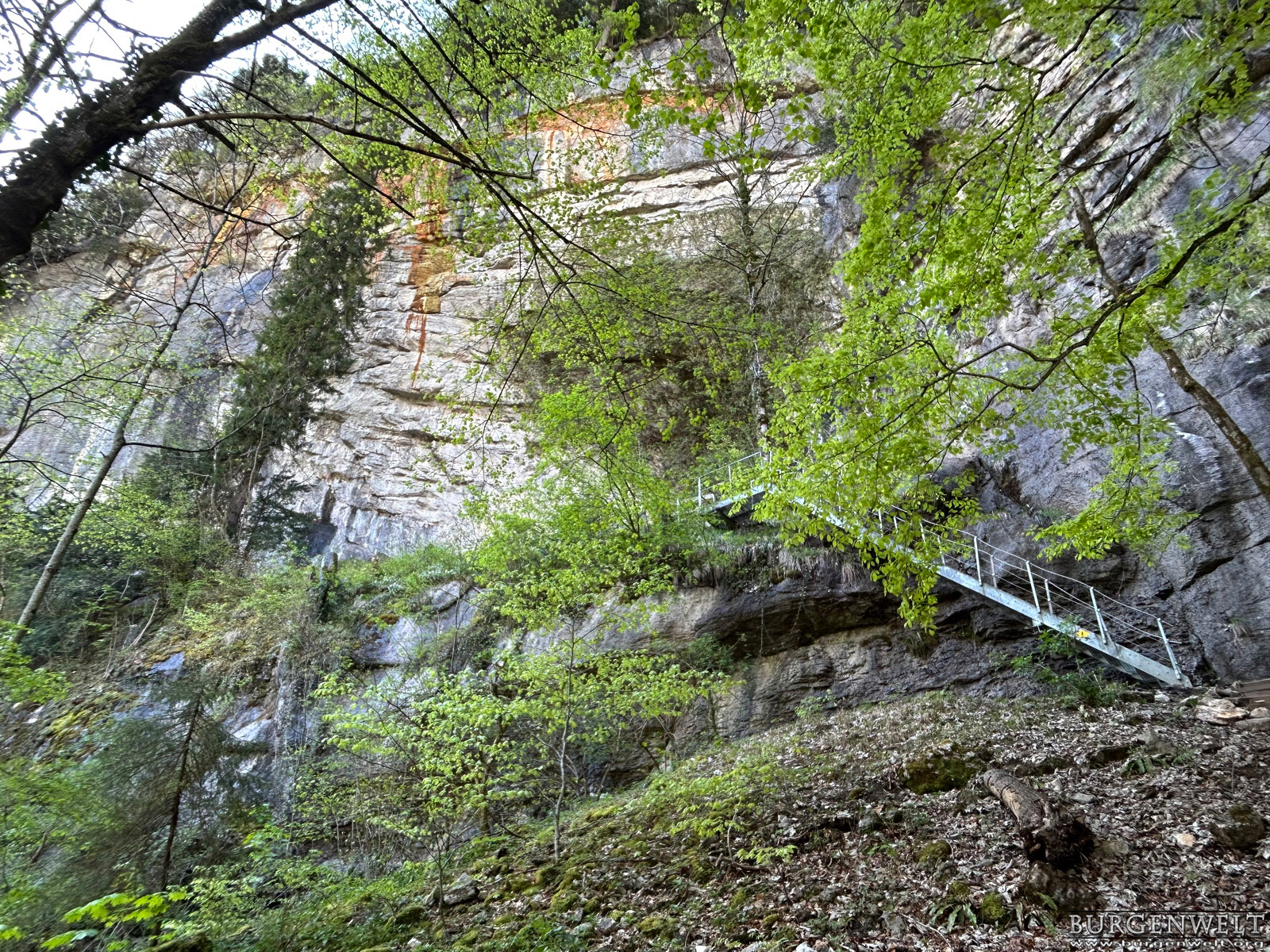 | Die Grottenburg Rothenfluh liegt spektakulär auf einem Felsabsatz unter der etwa 60 Meter hohen Wand der Tschingelfluh. Sie wurde vermutlich im frühen 13. Jhdt. durch die gleichnamigen Freiherren gegründet, später gehörte sie zur Herrschaft Unspunnen. Nach mehreren Besitzerwechseln im Spätmittelalter wurde die Anlage aufgegeben und war spätestens 1577 eine Ruine. 2003/04 wurde sie archäologisch untersucht und für die Öffentlichkeit mit einer Stahltreppe erschlossen. | |||||||||||||||||||||||||||||||