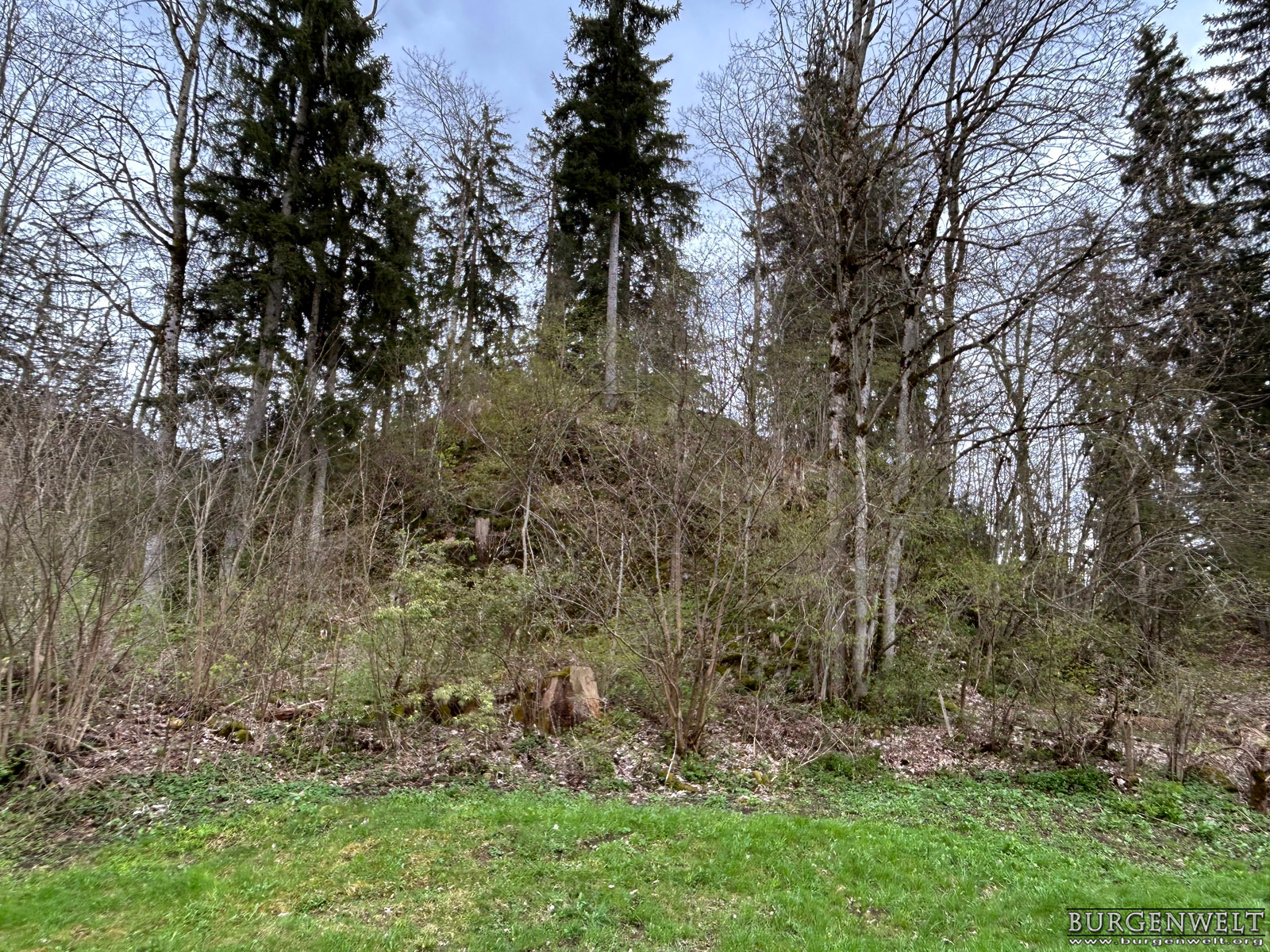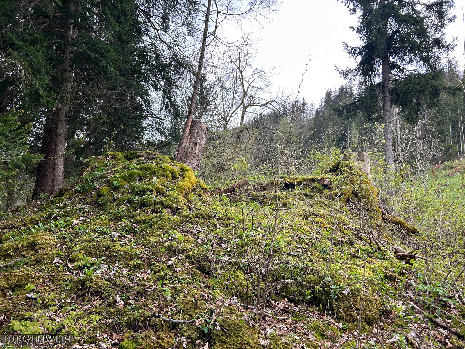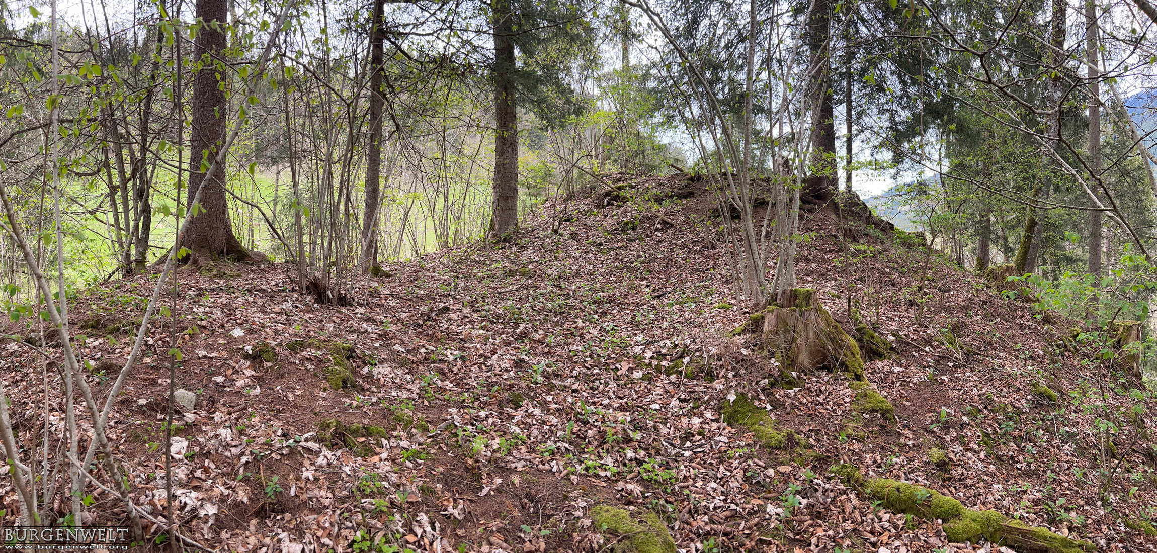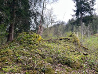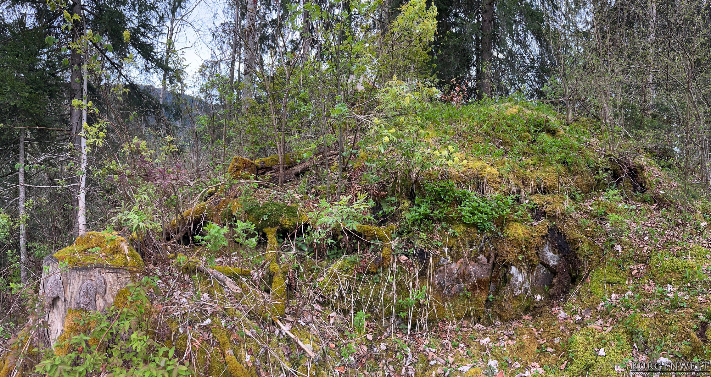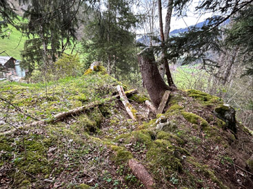 | Kleines Plateau mit Fundamentresten eines Turms auf einem Felsrücken gegenüber der Mannenberg-Burgen. Wie Letztere wurde auch Steinegg 1349 von den Bernern zerstört. Über Bauherrschaft und Besitzer sind keine Informationen überliefert. | |||||||||||||||||||||||||||||||