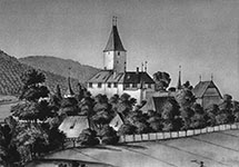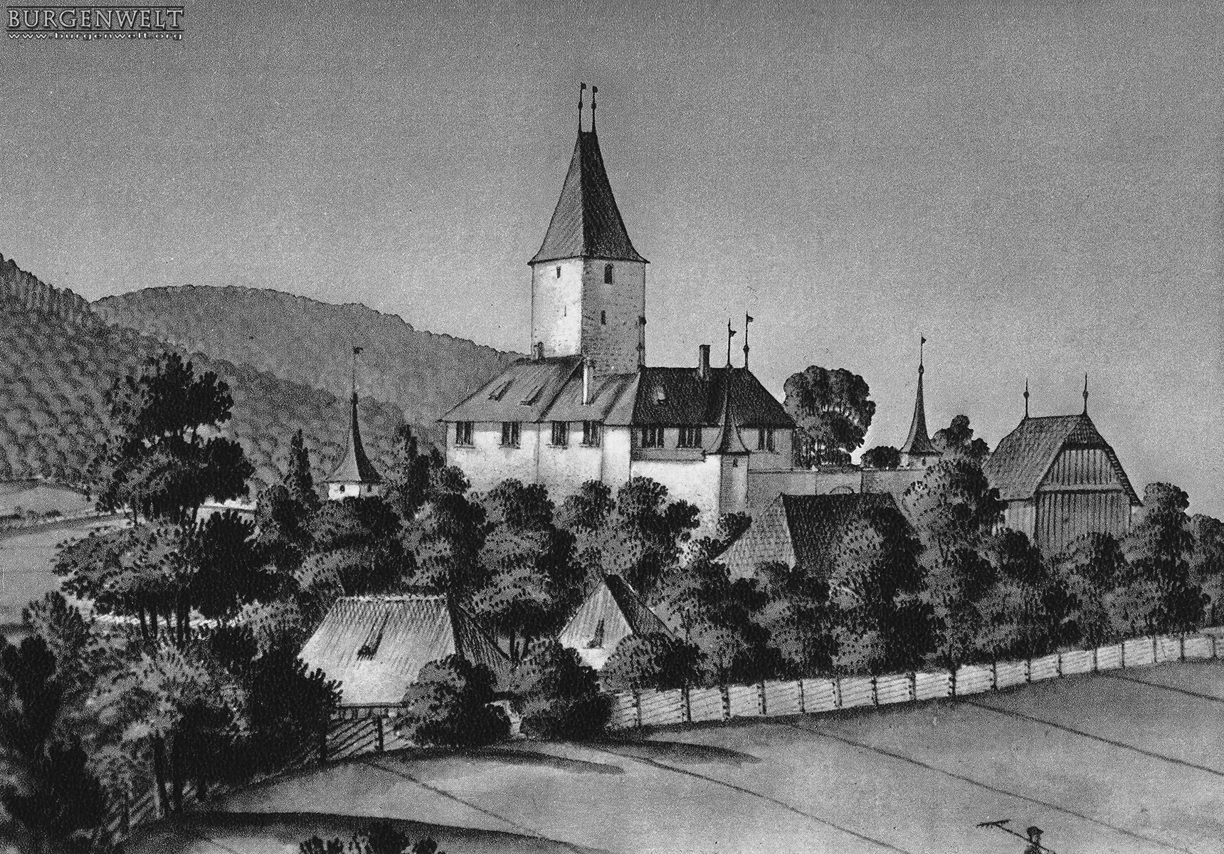 Die Burg Wil entstand vermutlich im 12. Jhdt. auf einem von weither sichtbaren Moränenhügel südöstlich von Bern. Zwar geht kein Bestandteil der heutigen Anlage auf diese Frühzeit zurück, doch dürfte hier der Wohnsitz des 1146 erwähnten Rudolf «de Wilare» gestanden haben. Die Freiherren von Wiler waren wie ihre Nachbarn in Worb Gefolgsleute der Herzöge von Zähringen. 1259 werden die Brüder Heinrich und Rudolf von Wiler im Zusammenhang mit einem Güterverkauf erwähnt, 1303 ein Johannes, der im Oberland Lehnsrechte veräusserte. Bald danach muss das Freiherrengeschlecht erloschen sein. Der mittelalterliche Baubestand Der eindrückliche Hauptturm zu Wil verfügt in seinen unteren Geschossen über Findlingsmauerwerk und wird deshalb in die erste Hälfte des 13. Jhdts. datiert. Er misst im Grundriss 11,5 x 11,5 Meter und weist bis zu 3,4 Meter starke Mauern auf. Vom ursprünglichen Baubestand sind noch einige Schartenfenster erhalten, während die grösseren Maueröffnungen in späteren Jahrhunderten entstanden sind. Im obersten Stockwerk sollen noch die Spuren eines Rauchabzugs zu sehen sein. Zum mittelalterlichen Baubestand scheinen auch einige Grundmauern des um den Turm errichteten Schlosses zu gehören. Dies gilt insbesondere für dessen Ostseite, wo unter dem Mauerverputz noch Findlingsblöcke erkennbar sind. Komplexe Besitzverhältnisse im Spätmittelalter Die Besitzverhältnisse nach dem Aussterben der Freiherren von Wiler sind nicht restlos geklärt. Mit der einen Hälfte der Herrschaft belehnten die Grafen von Neu-Kyburg als Landesherren die Minsterialenfamilie der Senn von Münsingen. Die andere Hälfte scheint zunächst in den Besitz der Freiherren von Signau gelangt zu sein, danach gehörten kleinere Anteile den Familien von Rüssegg, von Rinach und von Hünenberg. Ab der zweiten Hälfte des 14. Jhdts. waren es Berner Patrizierfamilien, die sich auf Burg Wil festsetzten. Die Signauer Hälfte der Herrschaft konnte bis 1365 der Berner Schultheiss Konrad von Holtz von den verschiedenen Teilbesitzern zusammenkaufen, sie gelangte 1404 an die Familie vom Stein. Die andere Hälfte besassen ab 1387 die Herren von Erlach und ab 1459 die Herren von Wyssenwegen. Erst 1514 gelang es Burkhard von Erlach, alle Güter und Rechte der Herrschaft Wil wieder in einer Hand zu vereinen. Neugestaltung unter der Familie von Wattenwyl Von 1527 bis 1634 gehörte Wil der Familie von Wattenwyl. Sie musste die Anlage nach einem Brand im Jahr 1546 weitgehend neu aufbauen und gestaltete sie dabei zum Schloss um. Der erhalten gebliebene Hauptturm wurde auf drei Seiten mit neuen Wohngebäuden umschlossen, während auf der Nordseite ein Hof frei blieb. Im Torbogen zum Korridor neben dem Turm befindet sich ein Allianzwappen von Wattenwyl-May mit der Jahreszahl 1546 – der Wiederaufbau scheint also unmittelbar nach dem Brand erfolgt zu sein. Weitere Umbauten im 17. und 18. Jhdt. 1634 gelangte Wil an die Familie von Diesbach, die das Schloss gegen Ende des 17. Jhdts. wiederum dem aktuellen Architekturstil anpassen liess. Nächste Besitzer waren ab 1717 die Frisching. Sie liessen um 1780 den auf älteren Abbildungen noch erkennbaren, mit zwei Ecktürmen und einer Mauer umgebenen Hof auf der Nordseite abbrechen, um Platz zu schaffen für einen neuen, spätbarock ausgestalteten Eingangsbereich. Auf der Südseite wurde eine weitläufige Parkanlage im französischen Stil angelegt, mit grossem Wasserbecken und einer Lindenallee. Im Revolutionsjahr 1798 veräusserte Gabriel Friedrich Frisching Schloss Wil und die zugehörige Domäne für 66’000 Pfund Silber an die Familie Kirchberger. Von dieser erwarb sie 1812 der Kanton Bern. Ab 1814 diente Schloss Wil als Sitz eines Oberamtmanns, ab 1831 als Verwaltungszentrum für den Amtsbezirk Konolfingen. Die heutige Nutzung des Schlosses Das Schloss wurde in den Jahren 1936/37 gründlich renoviert. Auch die Innenräume wurden im 20. Jhdt. immer wieder den Bedürfnissen der darin untergebrachten Amtsstellen angepasst. 2010 verlor das Schloss im Zuge einer Neueinteilung der Bezirke seine Bedeutung für den Kanton. Er verkaufte es im Folgejahr an Matthias Steinmann, der es in die «Steinmann Stiftung Schloss Wyl» einbrachte. Der neue Burgherr liess die Anlage sanft renovieren und stattete die Innenräume mit einer Sammlung alter Waffen und vielen Kunstwerken aus. Heute ist Schloss Wil wieder öffentlich zugänglich.  |