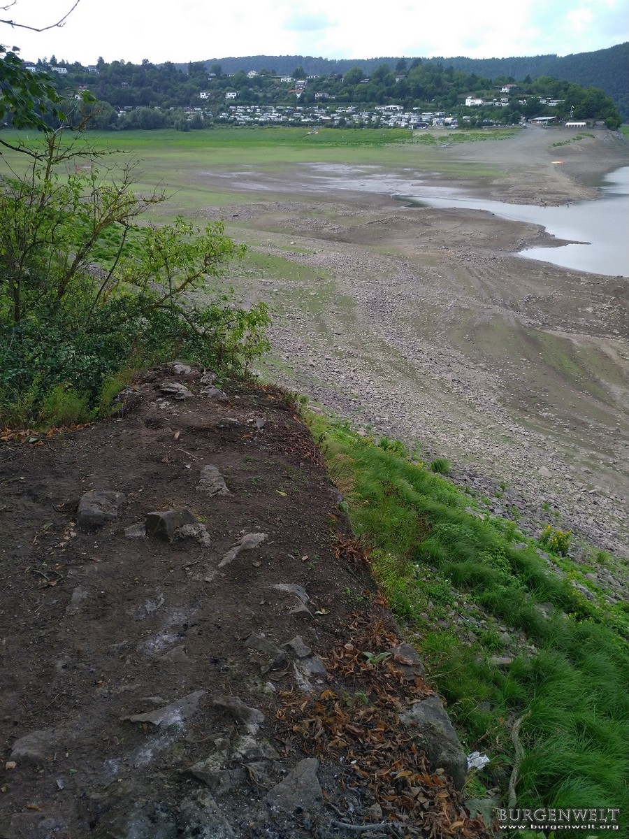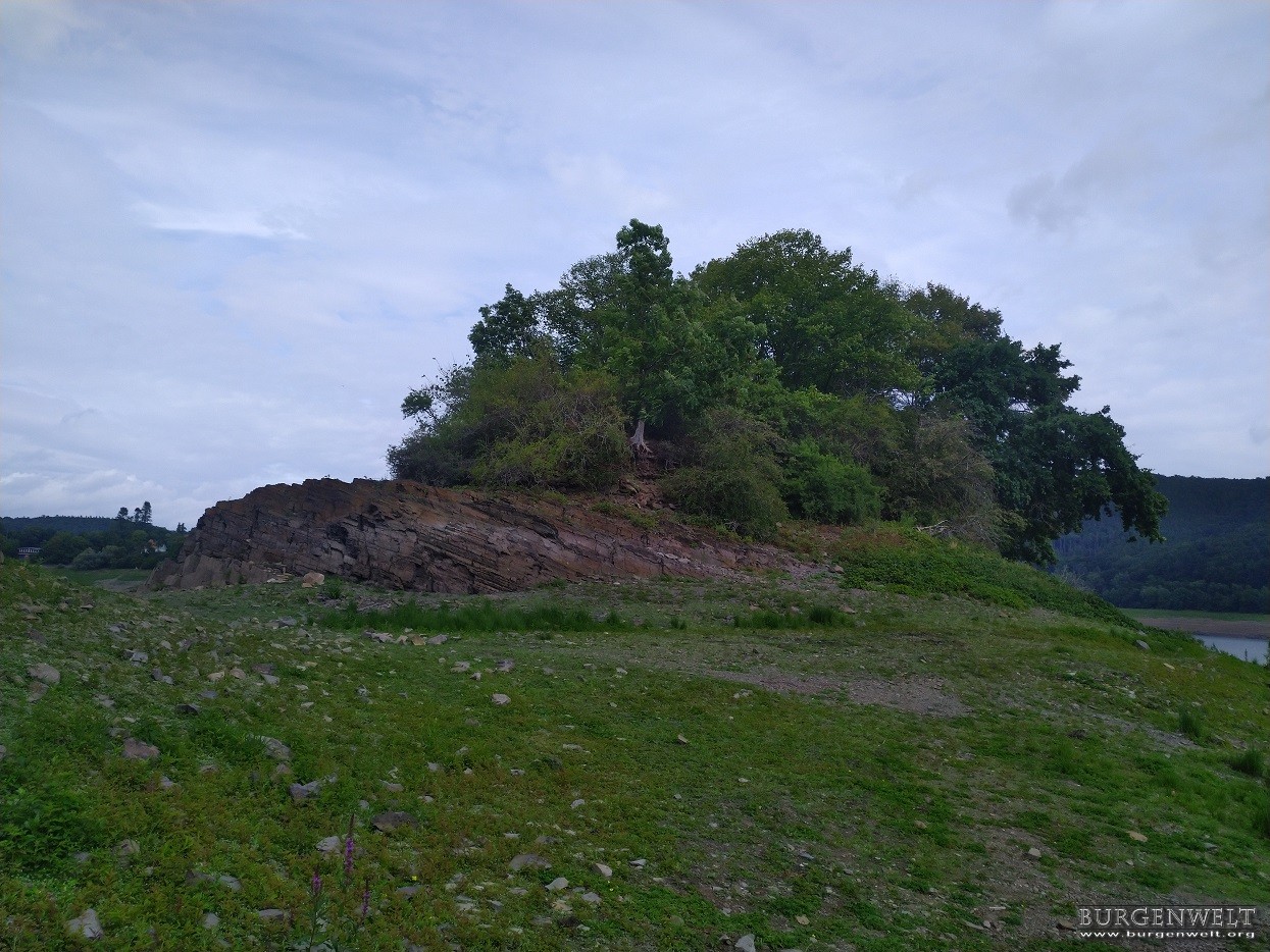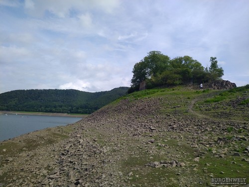 Die kleine Burganlage liegt seit dem Bau der Edertalsperre im Jahre 1914 auf einer kleinen Insel ("Liebesinsel"). Von der einstigen Höhenburg haben sich nur wenige Reste erhalten. Bei starkem Niedrigwasser ist es möglich die Burg zu Fuß zu besuchen.