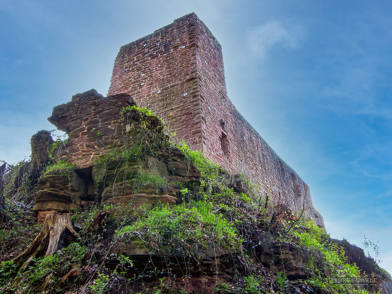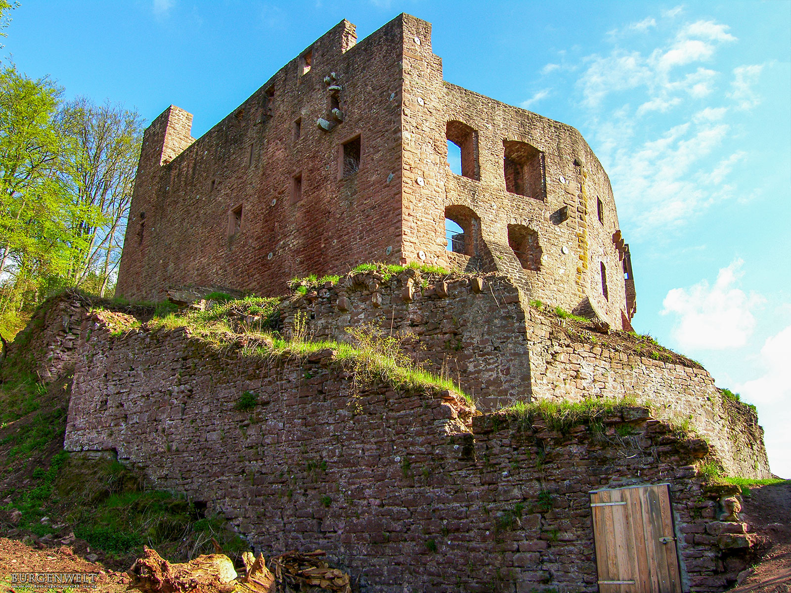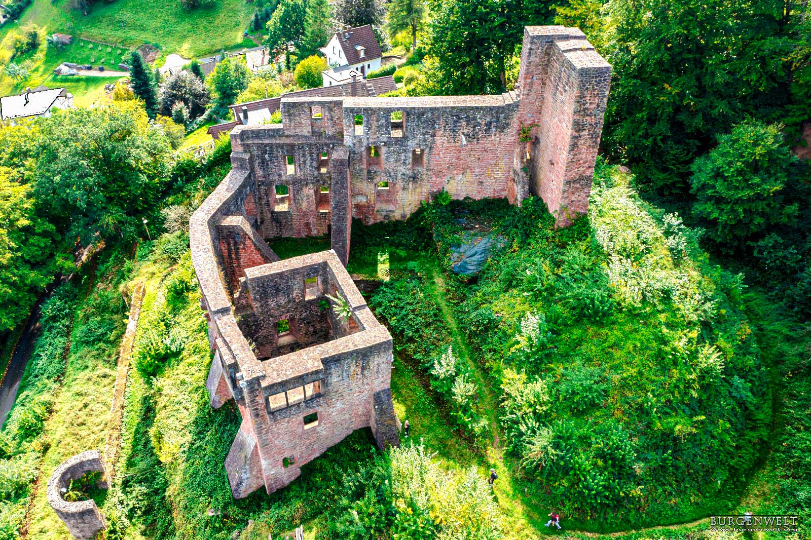 Die Sperrburg entstand während der Aufteilung der Besitzungen nach der Auflösung der Reichsabtei Kloster Lorsch an derer von Pfalzgrafen, Schenk von Erbach und Kurmainz. Die Burg ist vom Hang mit einem tiefen Halsgraben vom Berg abgetrennt. Die Schildmauer umschliesst zusammen mit der Ringmauer die Hauptburg. Ein doppelter Zwinger sichert die Burg zum Tal. Die Burg wurde immer wieder umgebaut und erweitert. Als Erstes soll ein Turm, die spätere Kapelle, errichtet worden sein. |