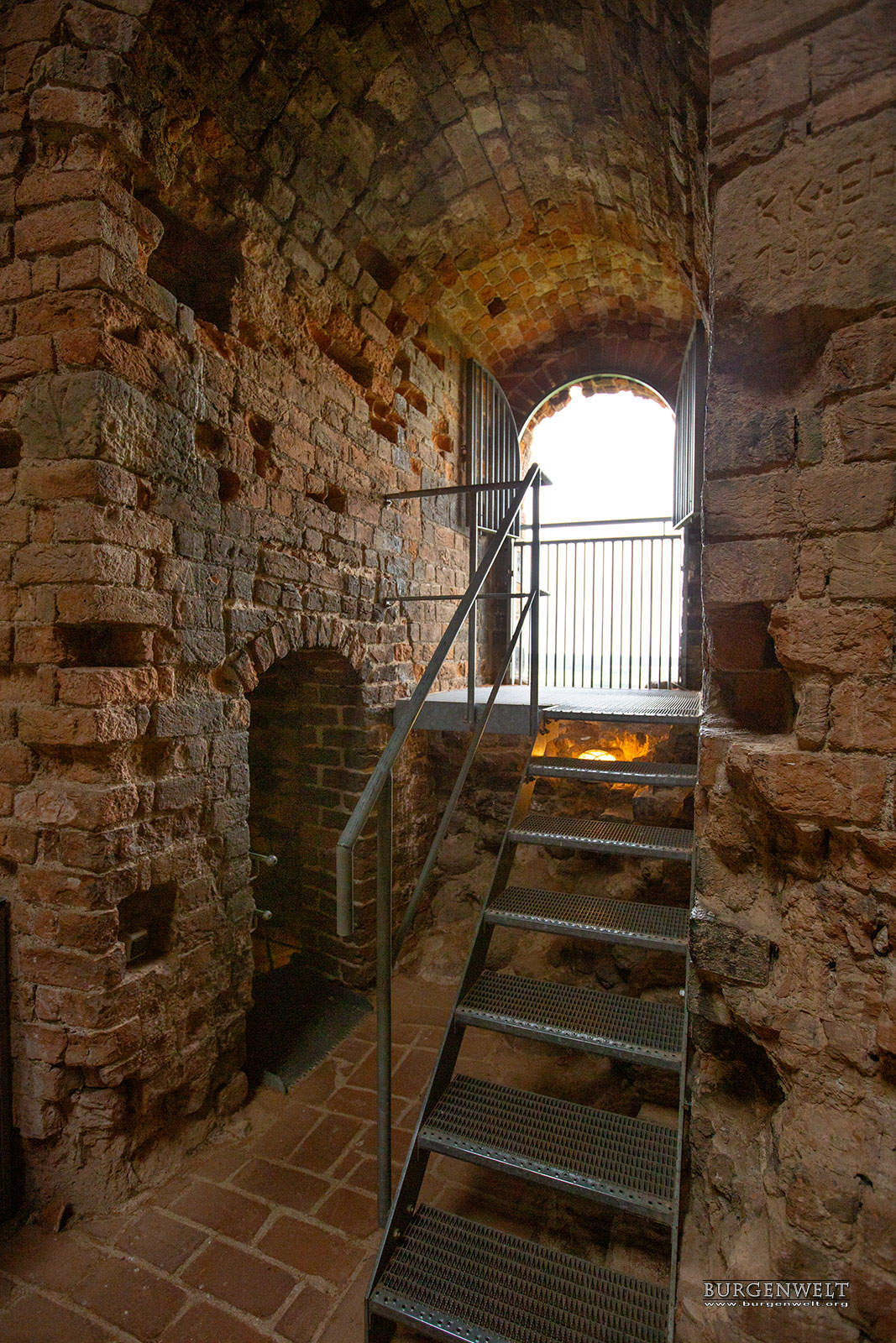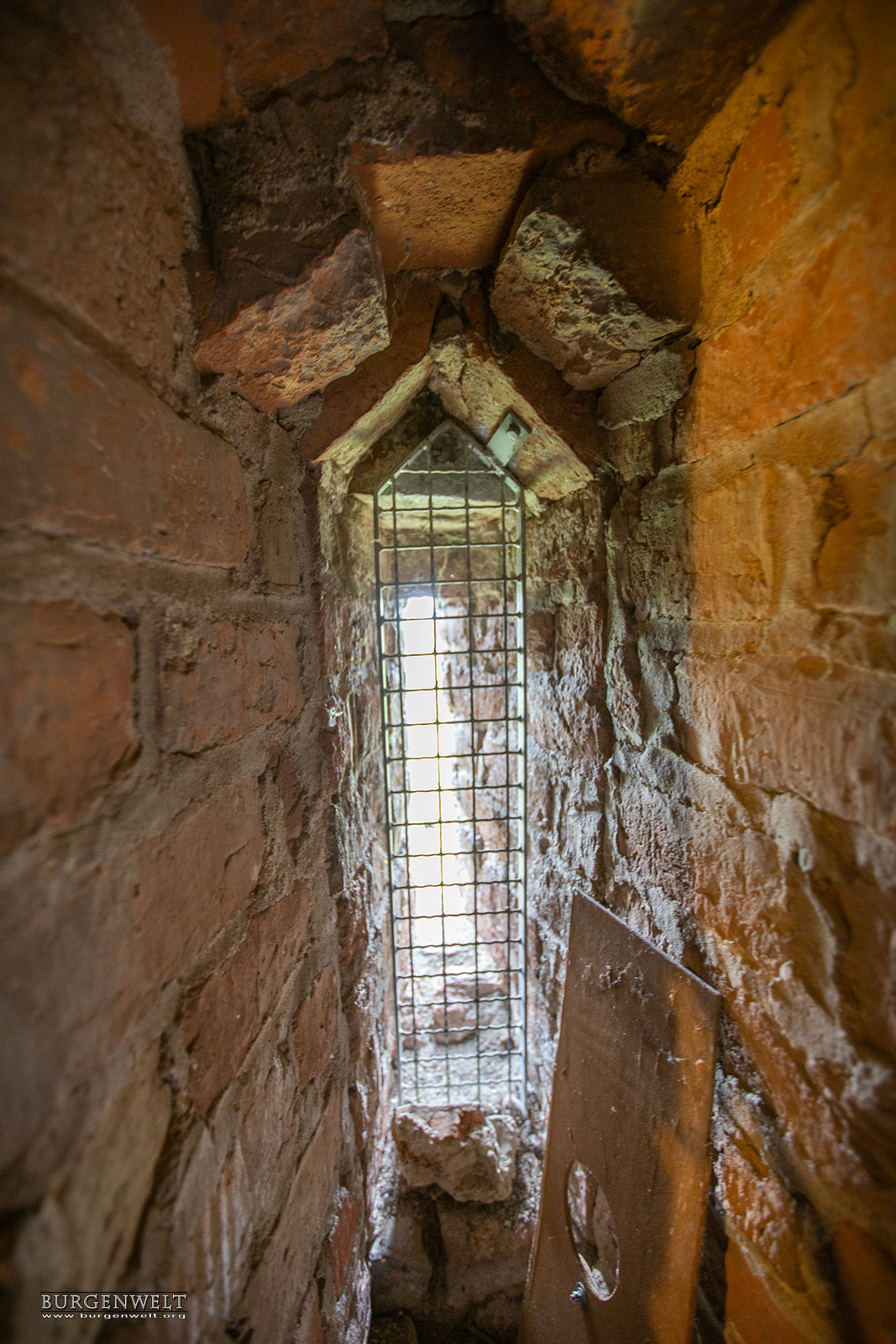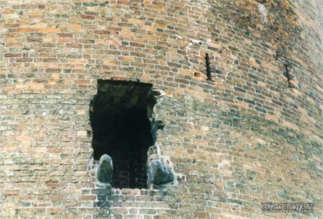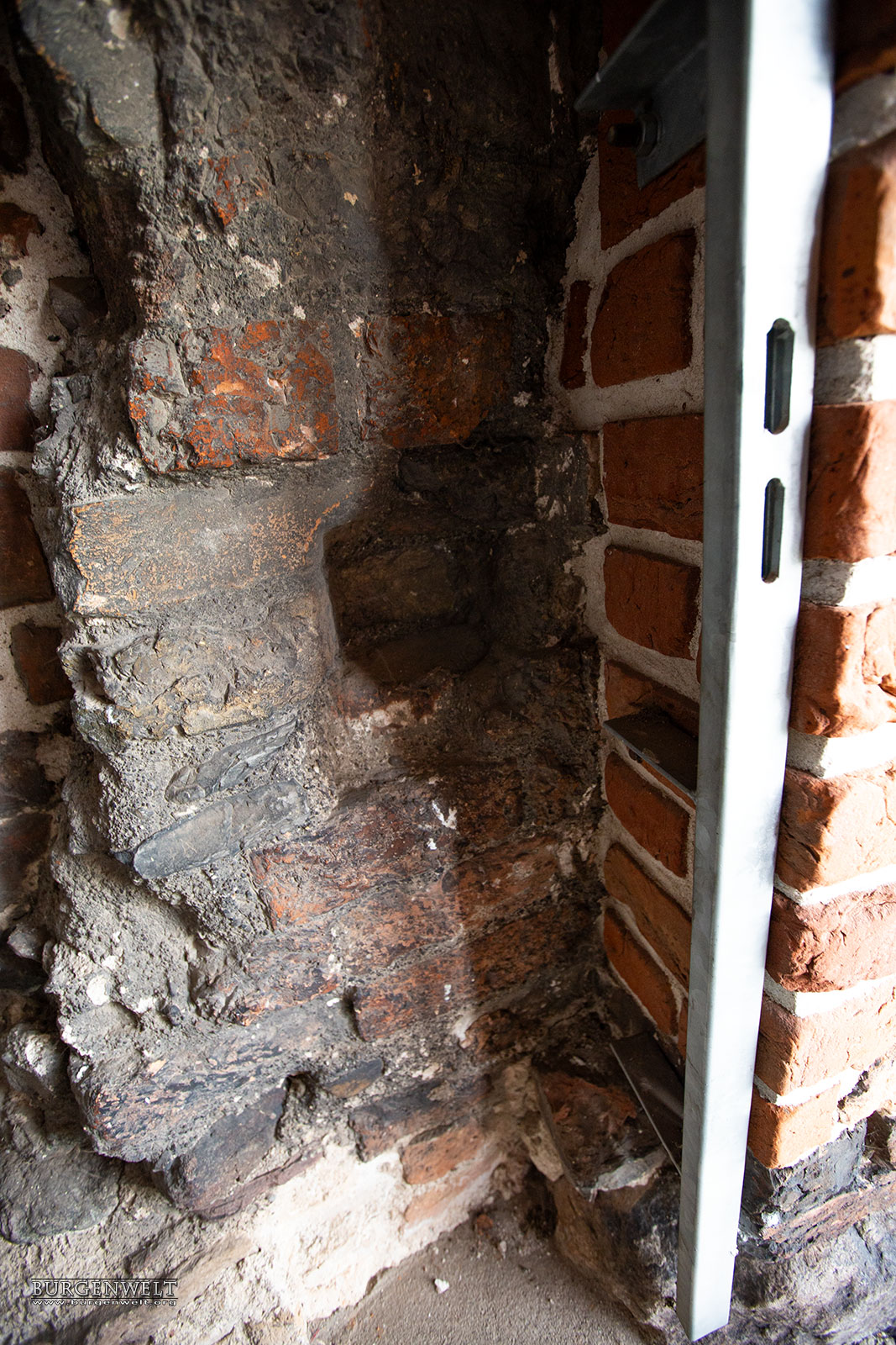 Eine zweite, in rund 6 m Höhe liegende Maueröffnung wurde später ohne Rücksicht auf den ursprünglichen Verband in das Mauerwerk gebrochen. Auch zwei kleine Scharten im Treppenaufgang sind nachträgliche Veränderungen und lassen sich an andersfarbigen Ziegeln erkennen.