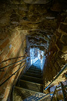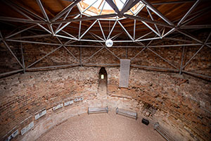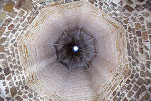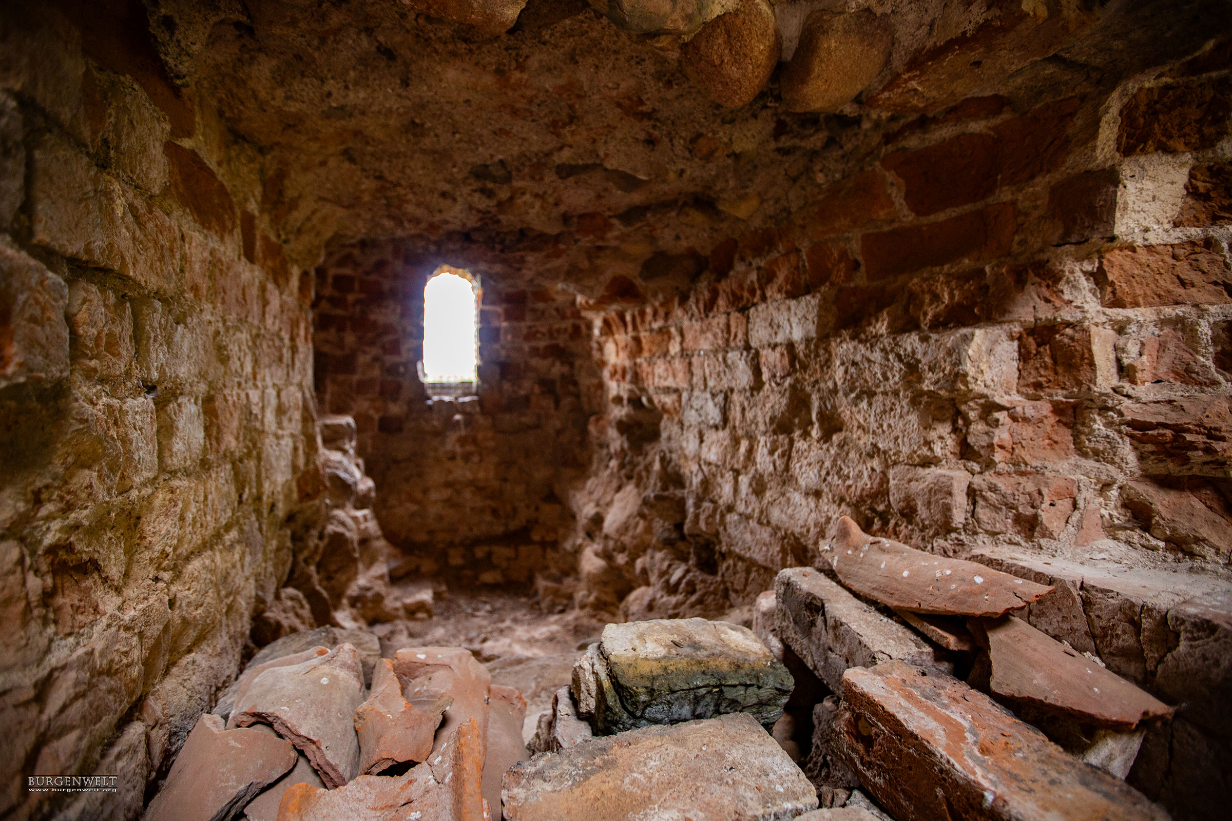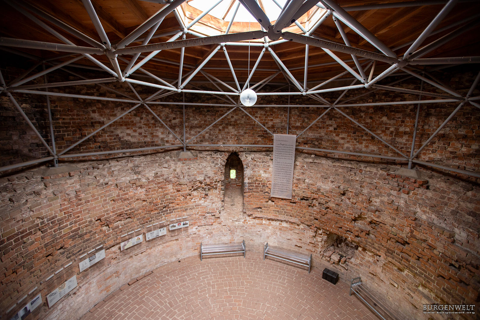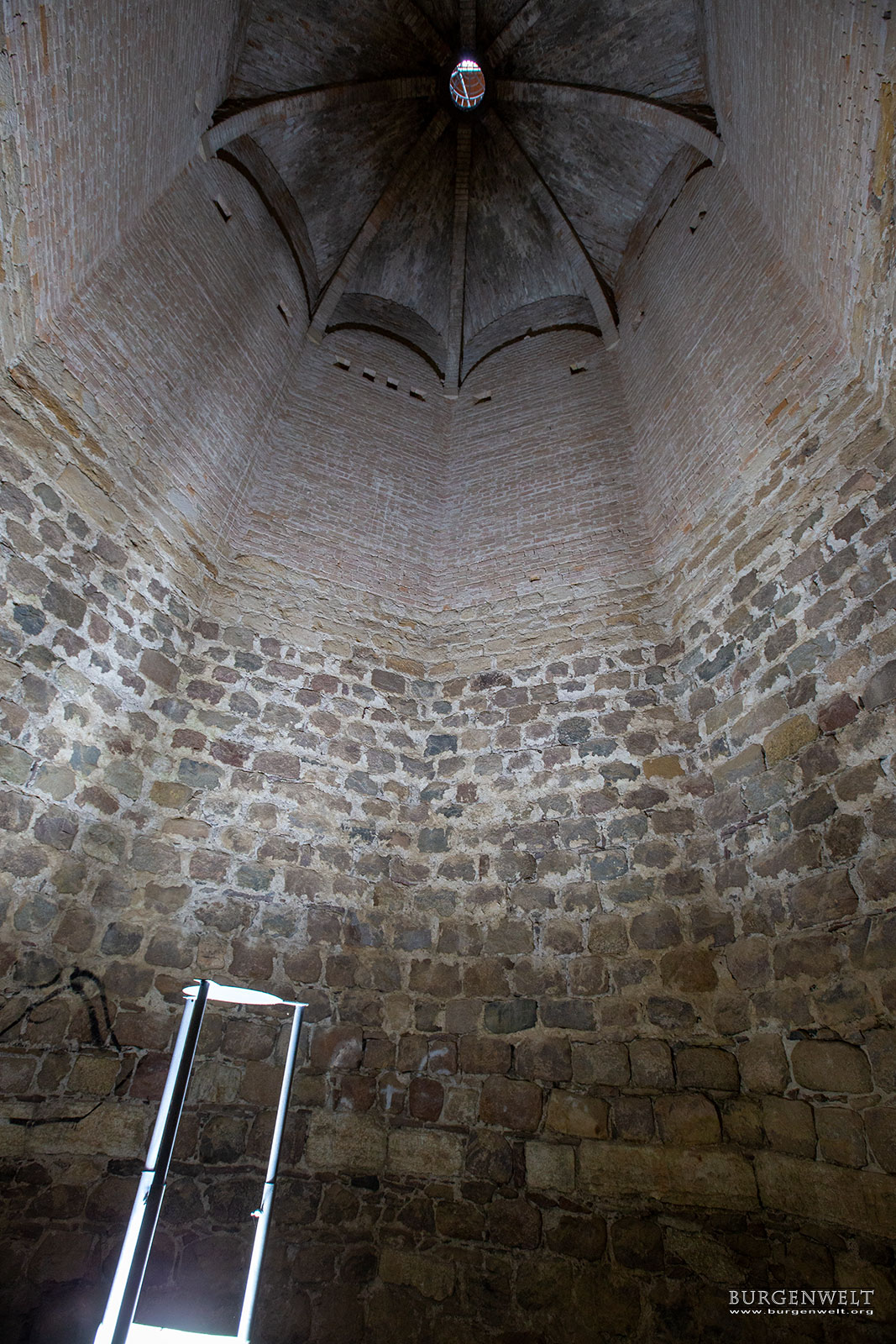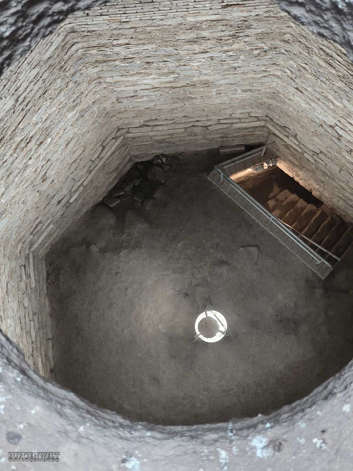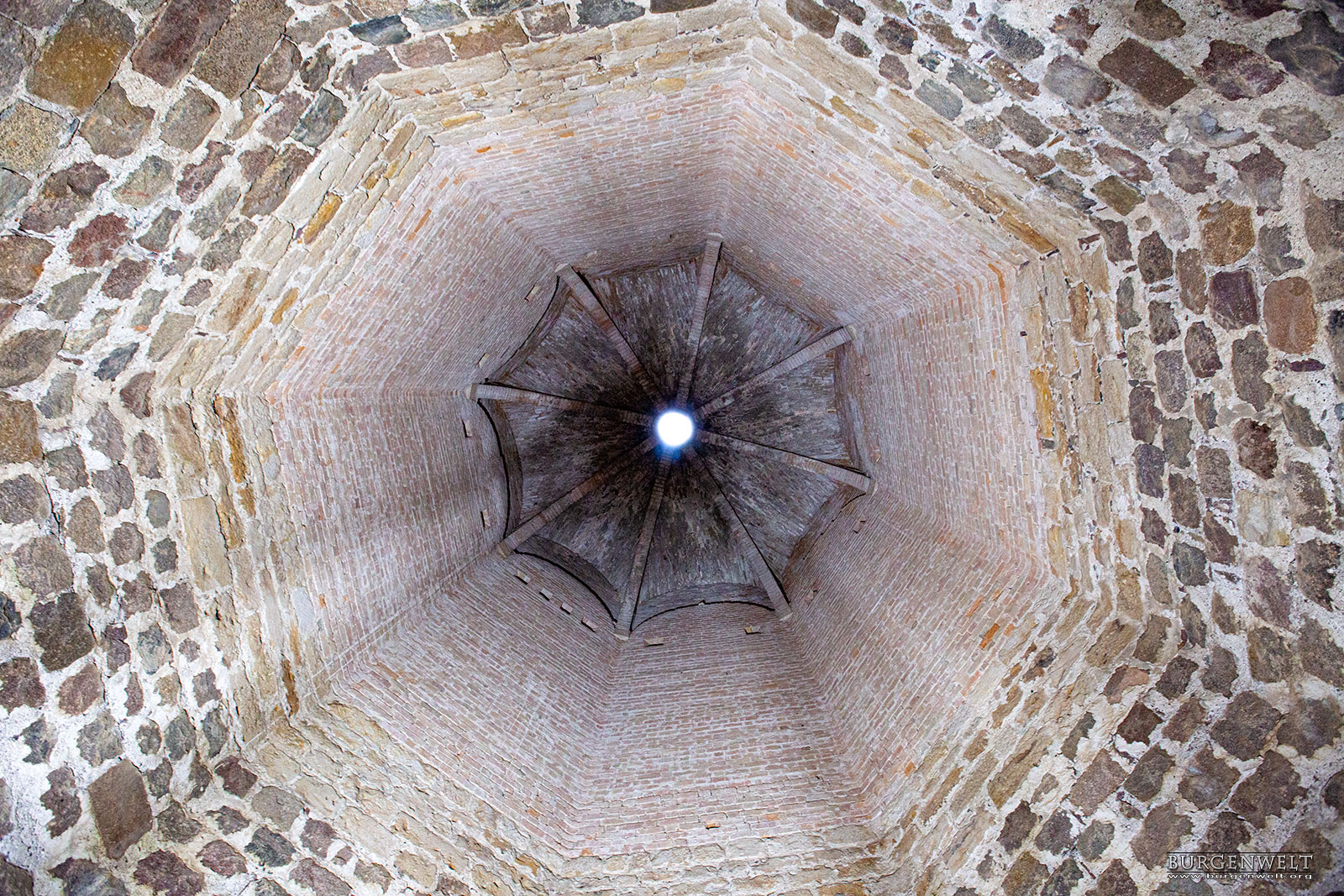 Das Innere des Turmes ist dreigeschossig. Das hohe, achteckige Erdgeschoss kann seit 1868 durch einen neuzeitlichen Stollen betreten werden; zuvor war es nur über eine runde Öffnung im Scheitel des Kuppelgewölbes zugänglich. Das darüberliegende Geschoss besitzt einen Zugang in etwa 10 m Höhe, an dem ein Podest erhalten blieb.