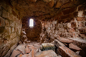 Das mittlere Geschoss, etwa 4 m hoch und 10 m breit, hat zwei Zugänge im Südosten, eine lange schmale Scharte nach Süden und zwei kleinere Öffnungen nach Nordwesten.