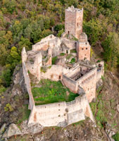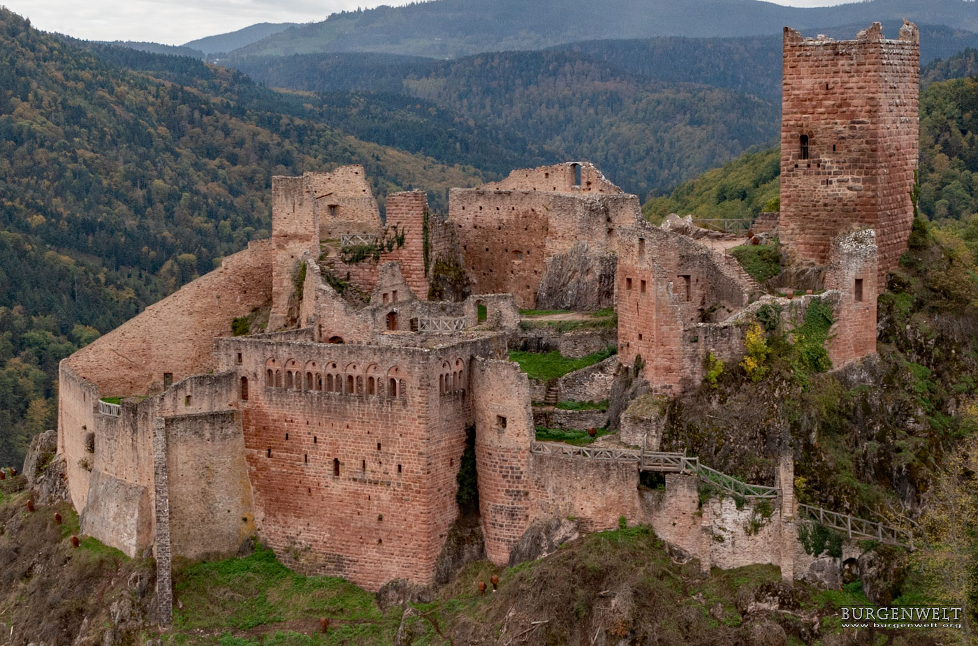 | Eine der grössten und beeindruckensten Burgruinen im Elsass, die zusammen mit Hohrappoltstein (Altenkastel) und Klein-Rappoltstein (Girsberg) ein Dreigestirn bildet. Gross-Rappoltstein war der bedeutendste Wohnsitz der Freiherren von Rappoltstein und wurde während dem Dreissigjährigen Krieg aufgegeben. Zu sehen sind mächtige Ruinen aus diversen Bauphasen, der Bergfried kann als Aussichtsturm bestiegen werden. | |||||||||||||||||||||||||||||||