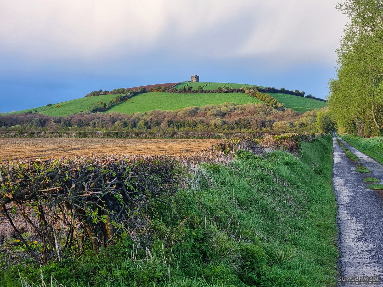 Es führt kein Weg auf den Burghügel. Die Ruine befindet sich auf landwirtschaftlich genutztem Privatgrund. |