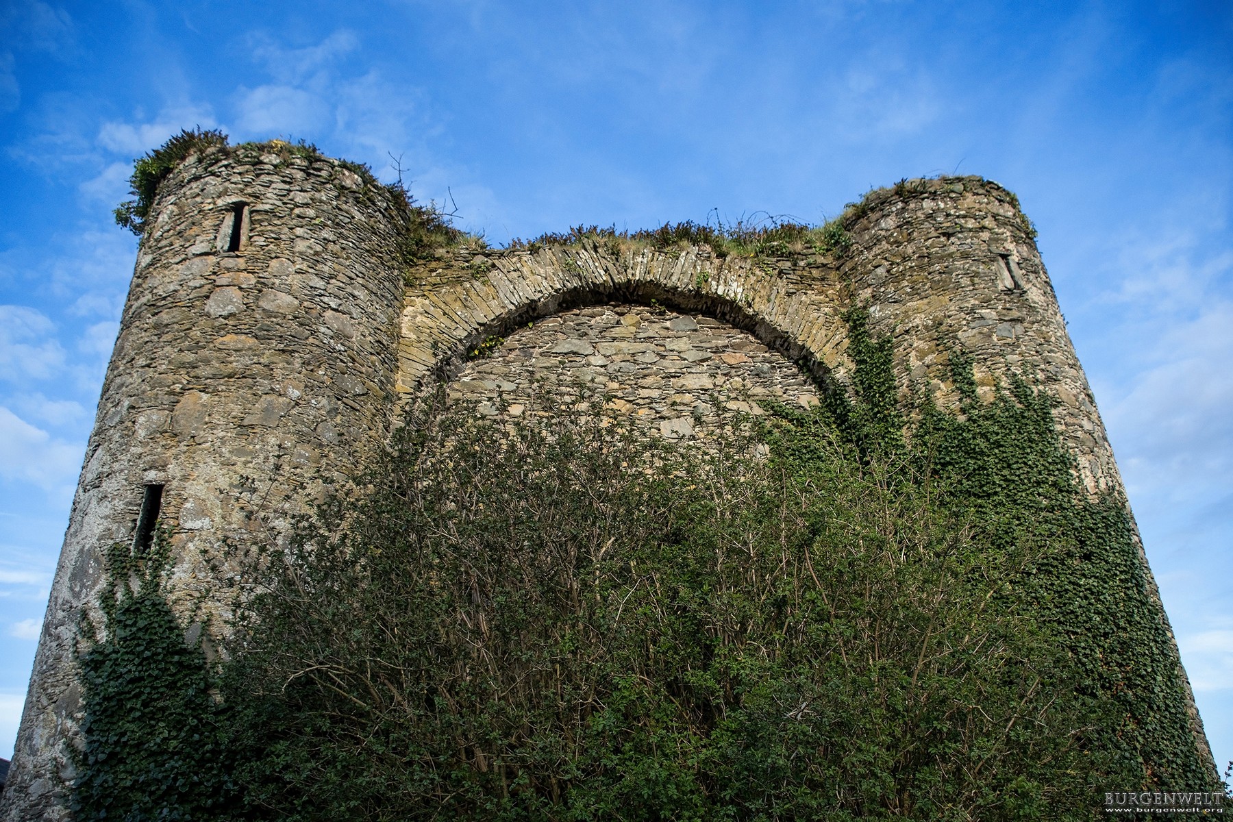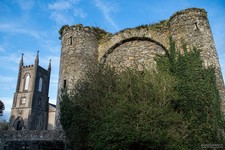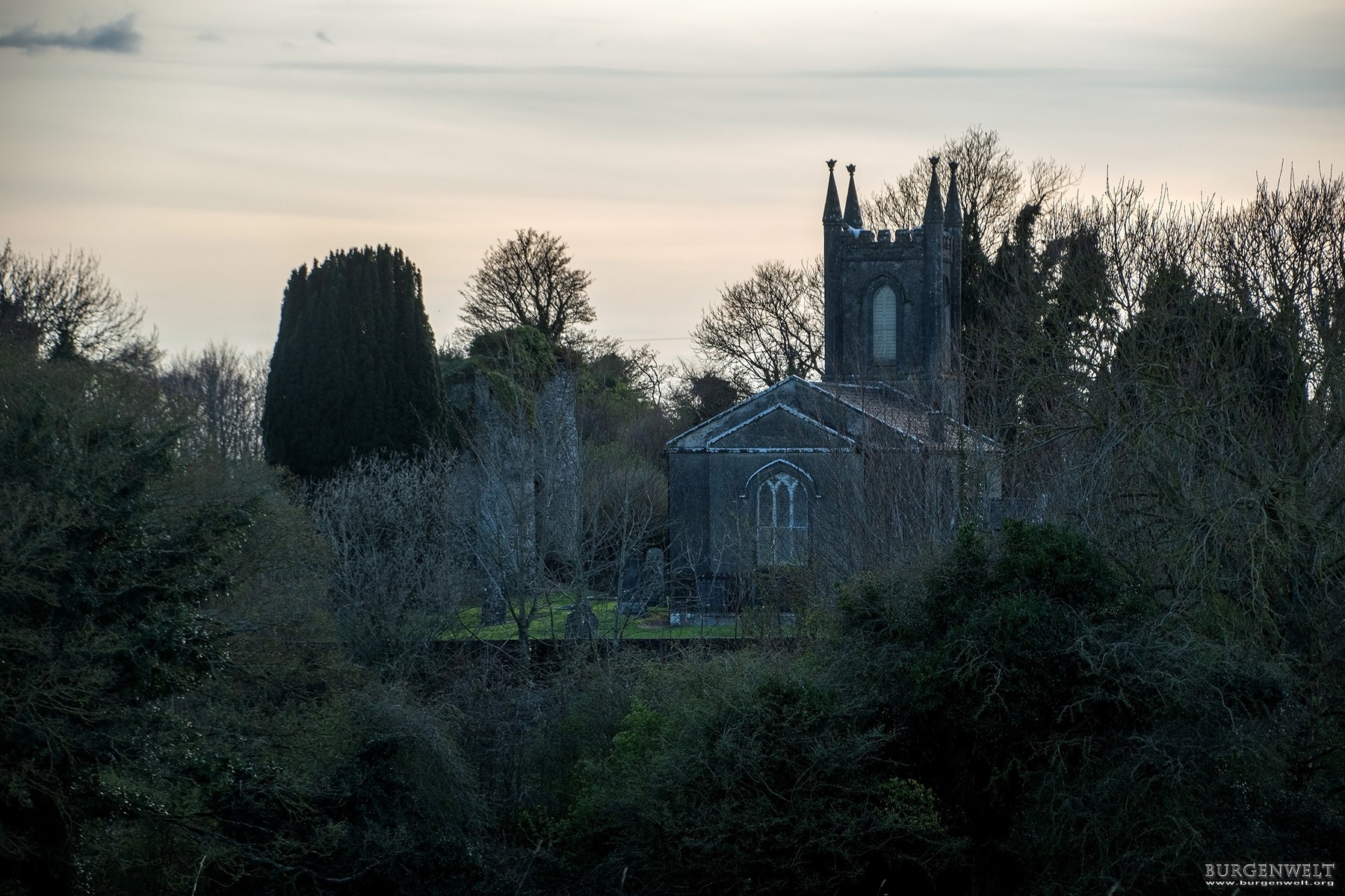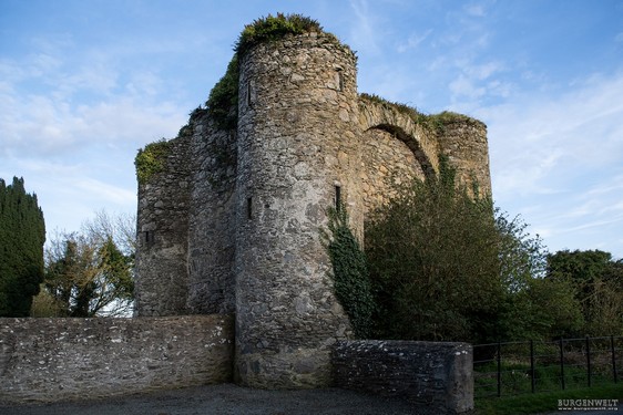 Die Burg aus dem 16. Jh. scheint 1784 noch bewohnt gewesen zu sein, denn ein antiker Stich zeigt sie mit einer Holztür und einer Treppe an der Westseite des nordwestlichen Turms, die zu einer Tür führt. Die nebenstehende St. Paul's Church wurde 1803 errichtet und 1827 umgebaut. |