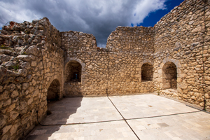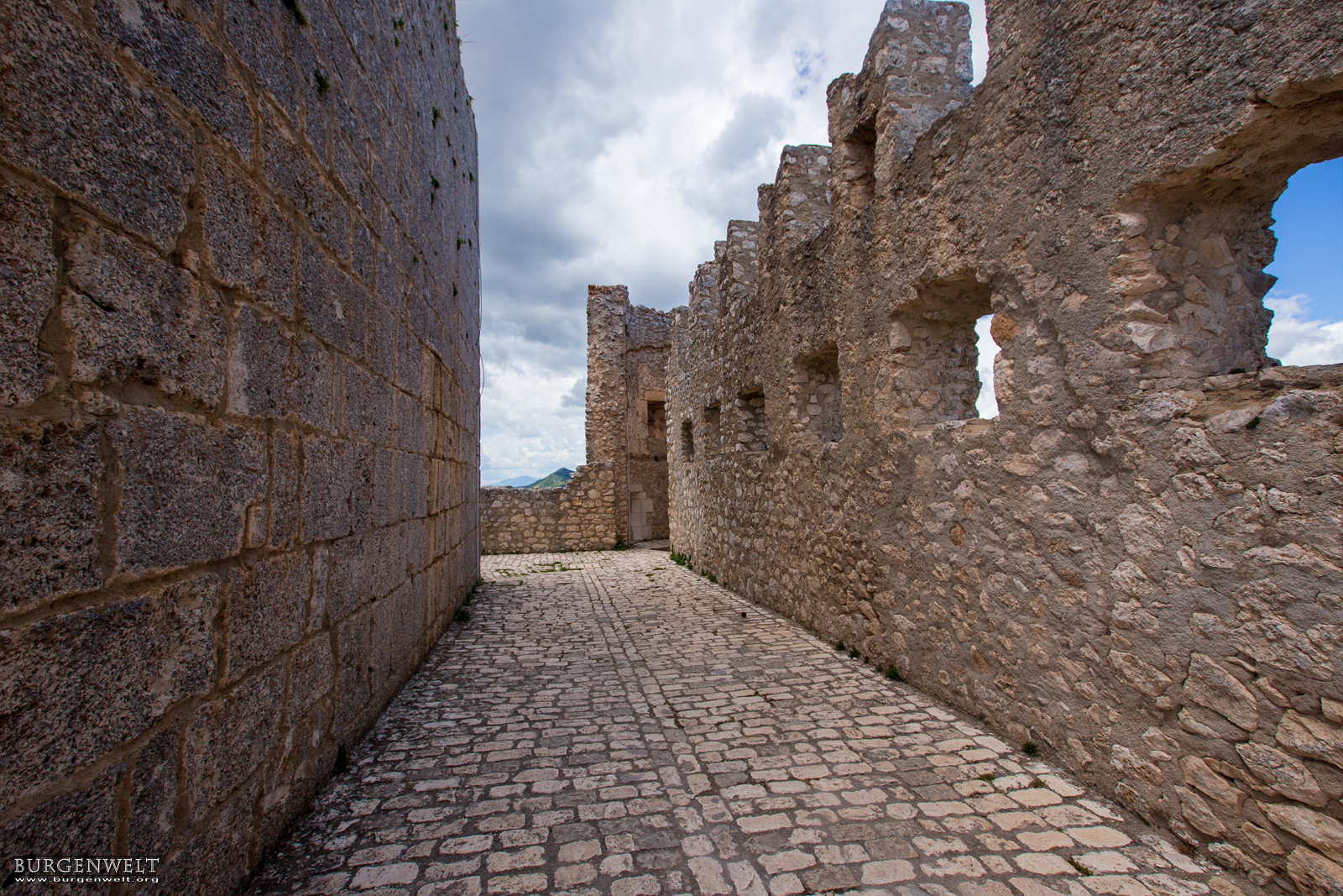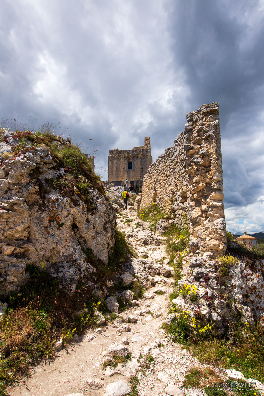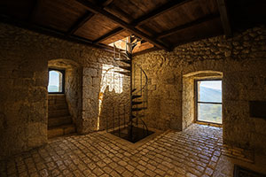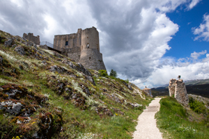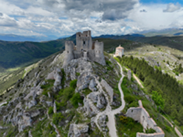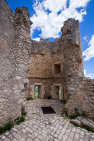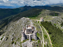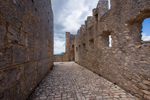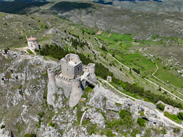 1470 hielten die umiegenden Dörfer über 90.000 Schafe, deren Wolle (die berühmte „lana carapellese“) nach L’Aquila und Florenz exportiert wurde. Dem Adligen Antonio Piccolomini wird um 1480 der Bau der vier Ecktürme um den ursprünglichen Turm zugeschrieben, zusammen mit der Stadtmauer und der Wiedererrichtung eines großen Teils des durch das Erdbeben von 1461 zerstörten Dorfes. 1579 verkaufte Costanza Piccolomini, die letzte der Familie, die Herrschaft an Francesco Maria de’ Medici für 106.000 Dukaten. 1703 zerstörte ein schweres Erdbeben die Burg und das Dorf. Nur die unteren Häuser wurden wieder aufgebaut, viele Bewohner zogen in das darunter liegende Dorf Calascio. 1743 viel die Region an die Bourbonen. 1957 wohnte niemand auf der Rocca Calascio. Zwischen 1986 und 1989 erfolgten Erhaltungs- und Restaurierungsarbeiten, die den fortschreitenden Verfall stoppten und den architektonischen und funktionalen Wert der gesamten Anlage, insbesondere des quadratischen zentralen Turms, bewahrten. |