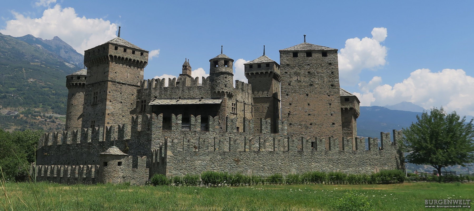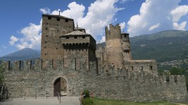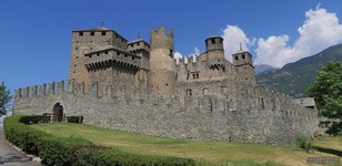Das beeindruckende Castello di Fénis ist eine der bekanntesten und heute eine der an besten erhaltenen mittelalterlichen Burgen des Aostatals in Norditalien.