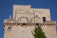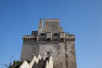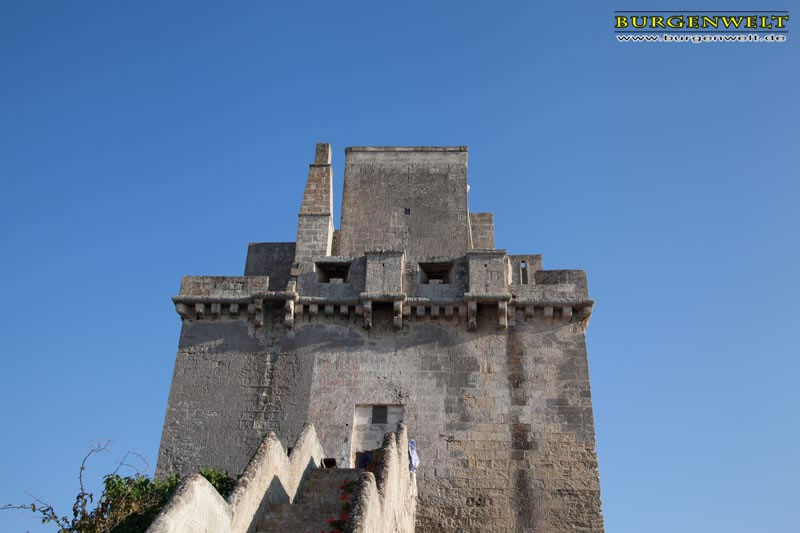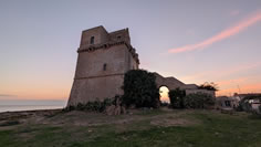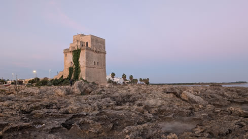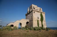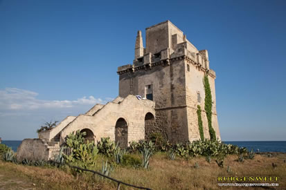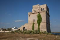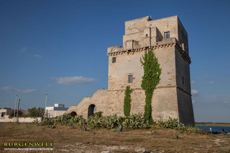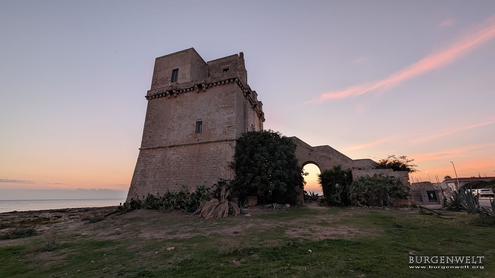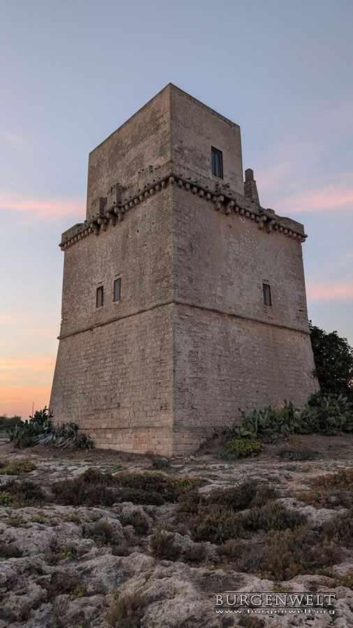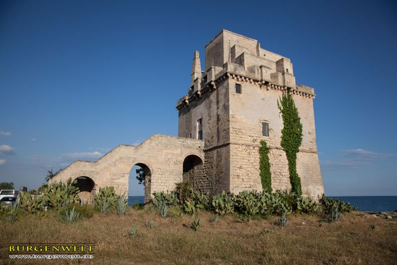 Einer der zahlreichen Küstenwachtürme im Süden Apuliens. Die rechteckige Form des Turms deutet auf seinen Bau in der zweiten Hälfte des 16. Jh. hin.