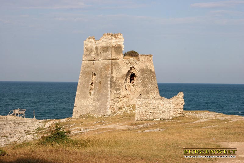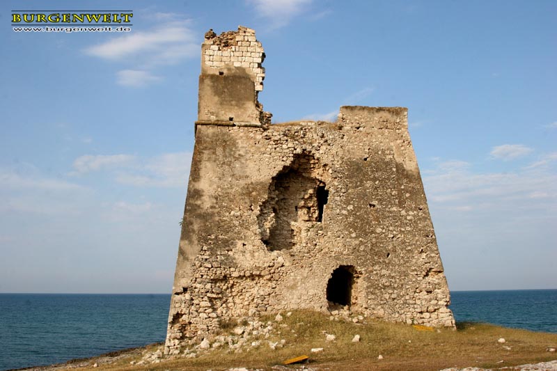 Einer der zahlreichen Türme zum Schutz der apulischen Küste. Die ersten dieser Wachttürme wurden bereits im Mittelalter errichtet. Im 16. Jh. erfolgte dann der Aufbau eines regelrechten Verteidigungssystem unter den Spaniern. 1748 zählte Apulien 131 dieser Türme. Merkmal der späten Türme ist ihre rechteckige Form mit geböschtem Sockel.