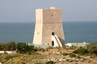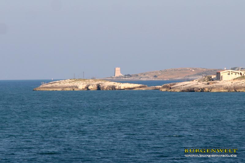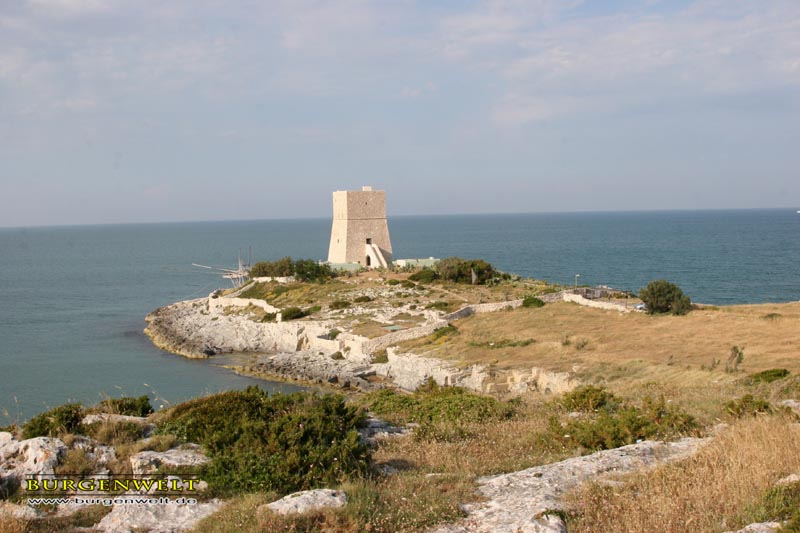 Einer der zahlreichen Türme zum Schutz der apulischen Küste. Die ersten dieser Wachttürme wurden bereits im Mittelalter errichtet. Im 16. Jh. erfolgte dann der Aufbau eines regelrechten Verteidigungssystem unter den Spaniern. 1748 zählte Apulien 131 dieser Türme. Merkmal der späten Türme ist ihre rechteckige Form mit geböschtem Sockel.