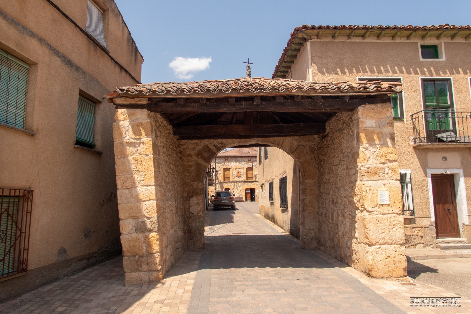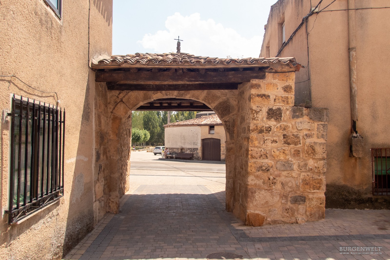 - Das Tor mit ziegelgedecktem Walmdach wurde mit wiederverwerteten Steinen aus der Römerstadt Clunia errichtet.