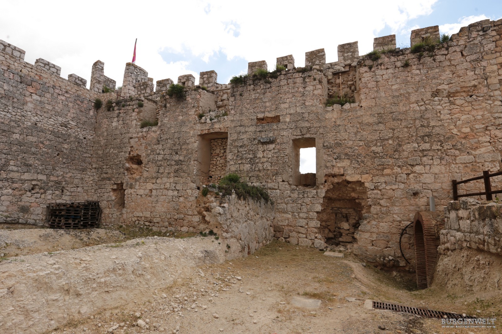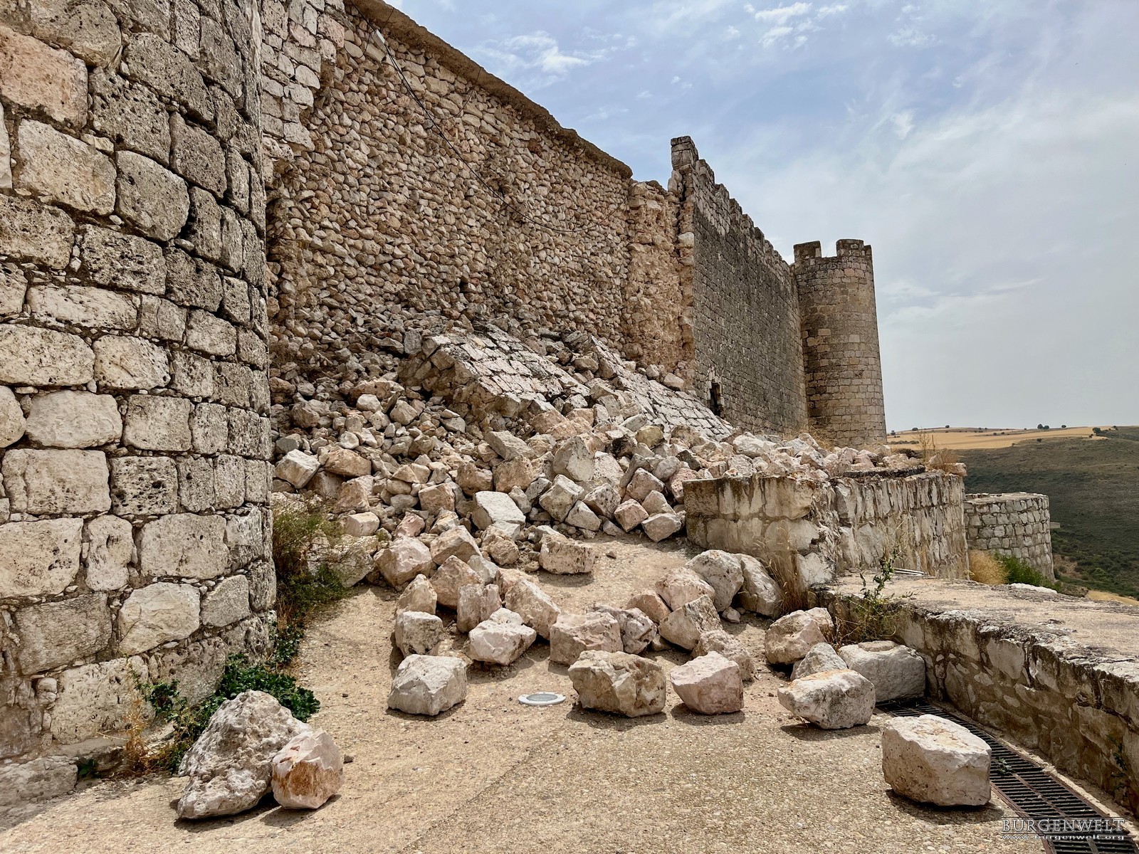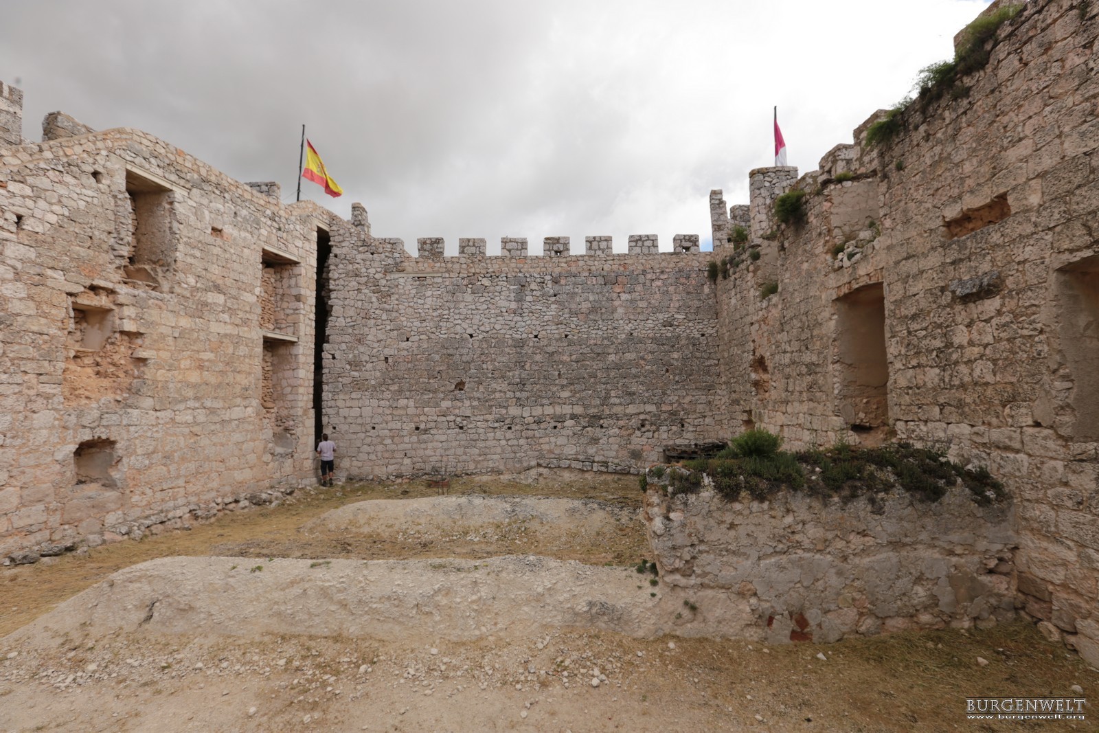 1081 - Rodrigo de Vivar, "El Cid", scheint in Jadraque gewesen sein, entweder auf seinem eigenmächtigen Feldzug oder der darauf folgenden Verbannung und seinem Weg ins Exil in Saragossa. 1085 - König Alfons VI. von Kastilien erobert den Ort von den Mauren, der danach zunächst noch unter der Gerichtsbarkeit von Atienza steht. 1140 - Jadraque wird im "Lied des Cid" als eine der wichtigen Burgen von Guadalajara erwähnt. Die Herren der Burg werden als Herzöge des Cid bezeichnet. 1434 - König Juan II. schenkt Jadraque und seine Ländereien an seine Verwandte Doña Maria de Castilla zur Hochzeit mit Don Gómez Carrillo 1469 - Ihr Sohn Don Alfonso Carrillo de Acuña gibt die Burg im Tausch für andere Ländereien an Don Pedro González de Mendoza, den damaligen Bischof von Sigüenza und späteren Großkanzler der Katholischen Könige weiter. Mendoza beginnt mit dem Umbau zur heutigen Burg in mittelalterlichem Stil, aber mit palastartigen Elementen im Inneren. Die fast rechteckige Burg mit der Ausdehnung von 70 x 18 Metern kommt ohne Bergfried aus, verfügt aber über zahlreiche Türme entlang der hohen Mauern. Bei seinem Tod erbt sein Sohn, Don Rodrigo Díaz de Vivar y Mendoza, Marquis von Zenete und Graf von El Cid.das Castillo. 1899. - die letzten Adelsherren verkaufen die Burg für symbolische 300 Peseten an die Stadt Jadraque. 2002-2007 - Archäologische Ausgrabungen. 2016 - die Burg wird restauriert. |