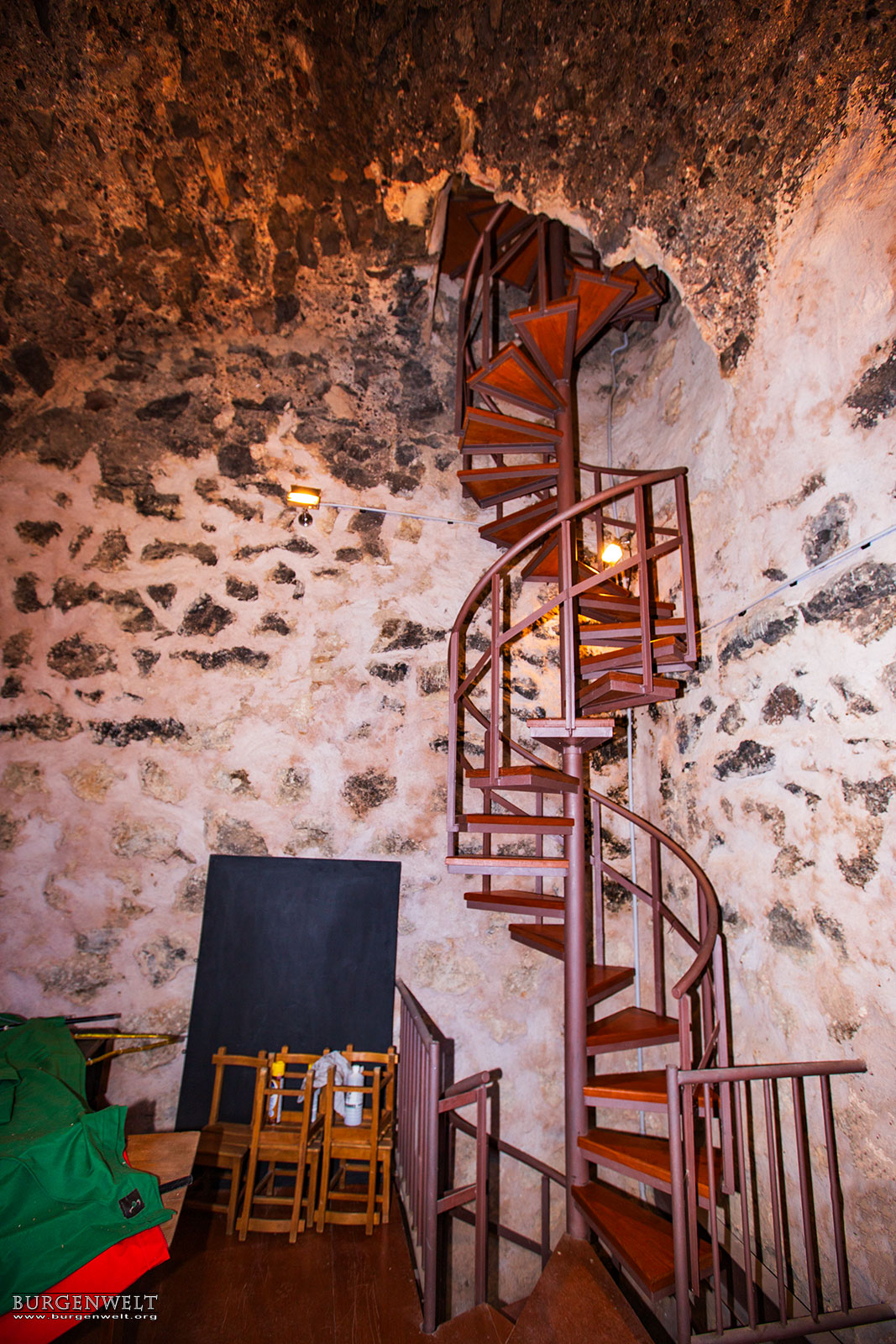 Gut erhaltener Turm aus Bruchsteinen mit sauber gearbeiteten Quadersteinen an den Ecken. |
