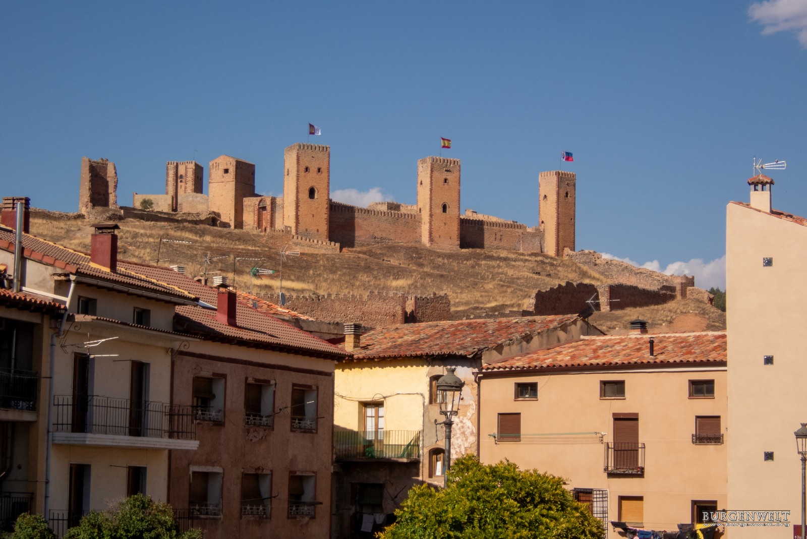 Phantastische maurische Burganlage, die sich vom Turm an der Bergspitze bis zur Stadtmauer am Flussufer hinzieht. Sehr gut erhalten.